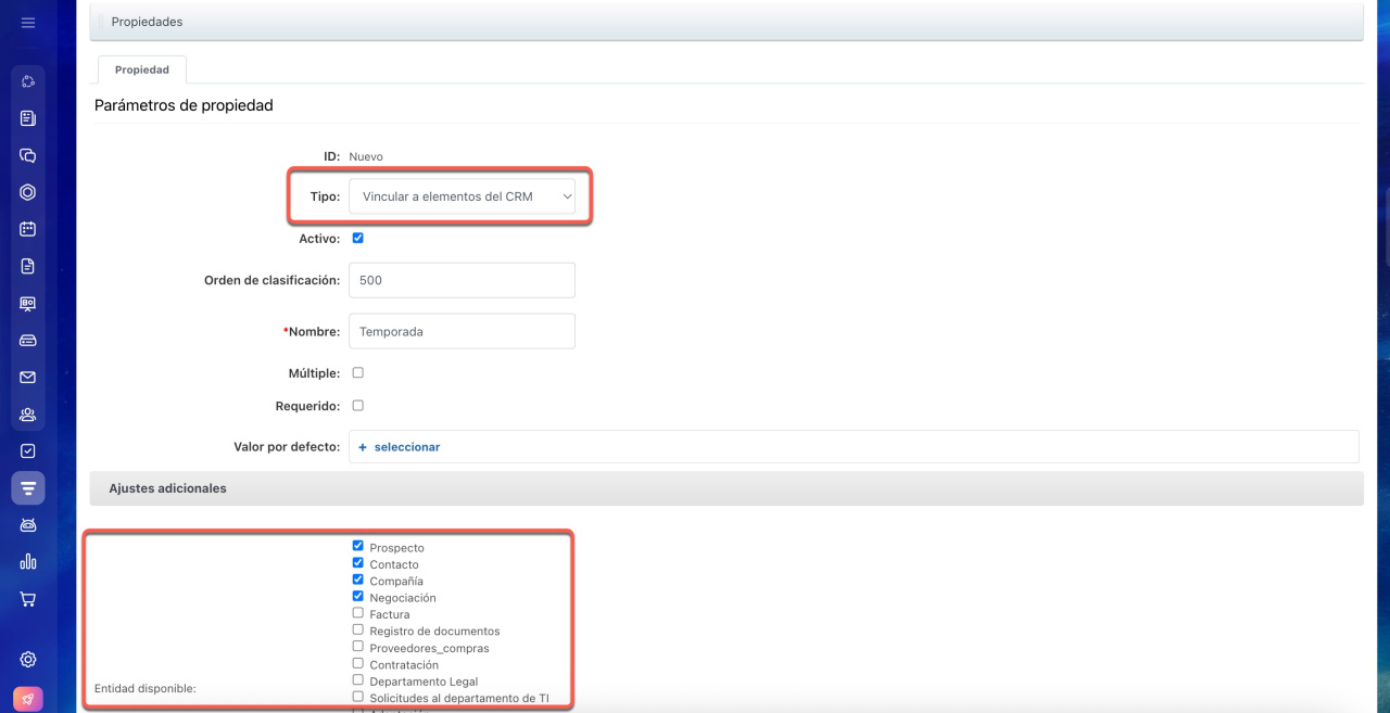 Vincular a elementos del CRM. La opción Entidad disponible define con qué elementos del CRM se puede vincular el producto o servicio, permitiendo un acceso rápido desde su ficha.