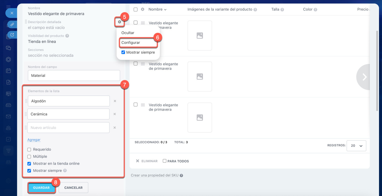 - Múltiple: permite añadir varios valores en un mismo campo (por ejemplo, varios materiales para un producto).