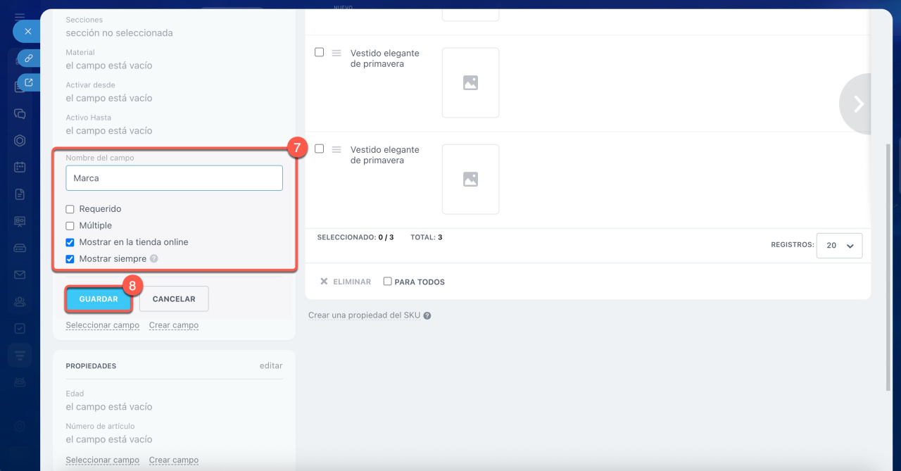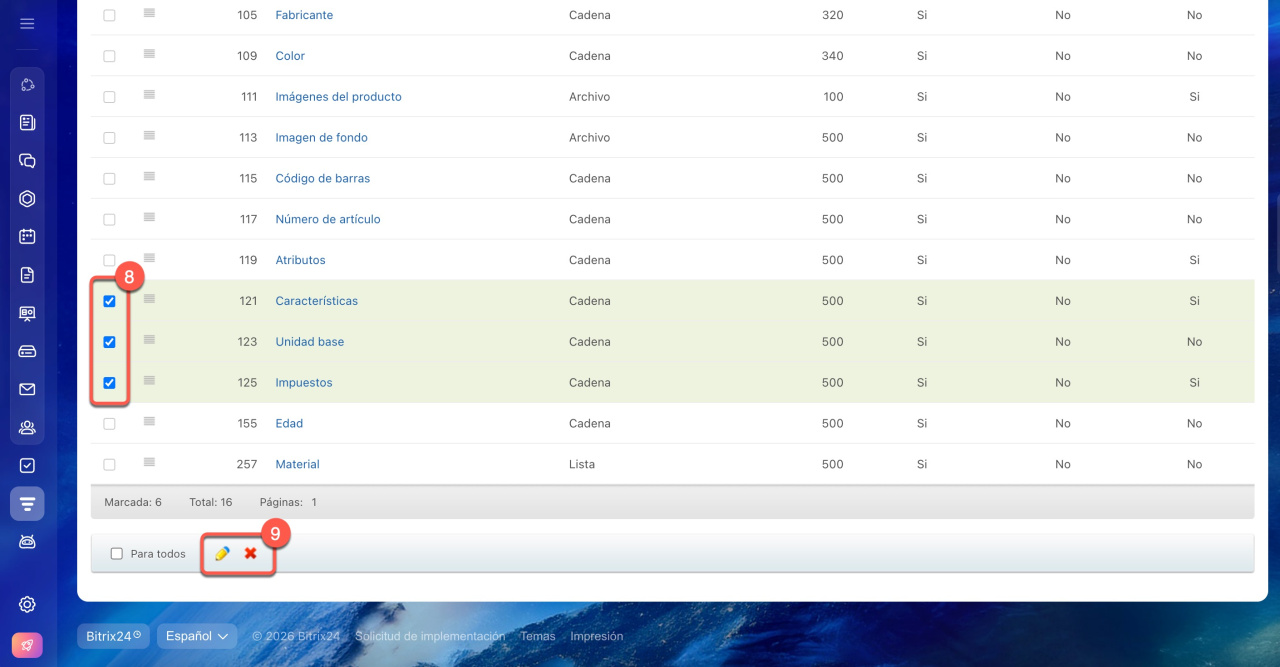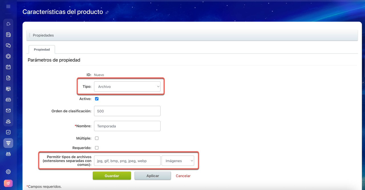 - Mostrar en la tienda online: permite buscar productos y servicios por esta propiedad en la tienda online de Bitrix24.