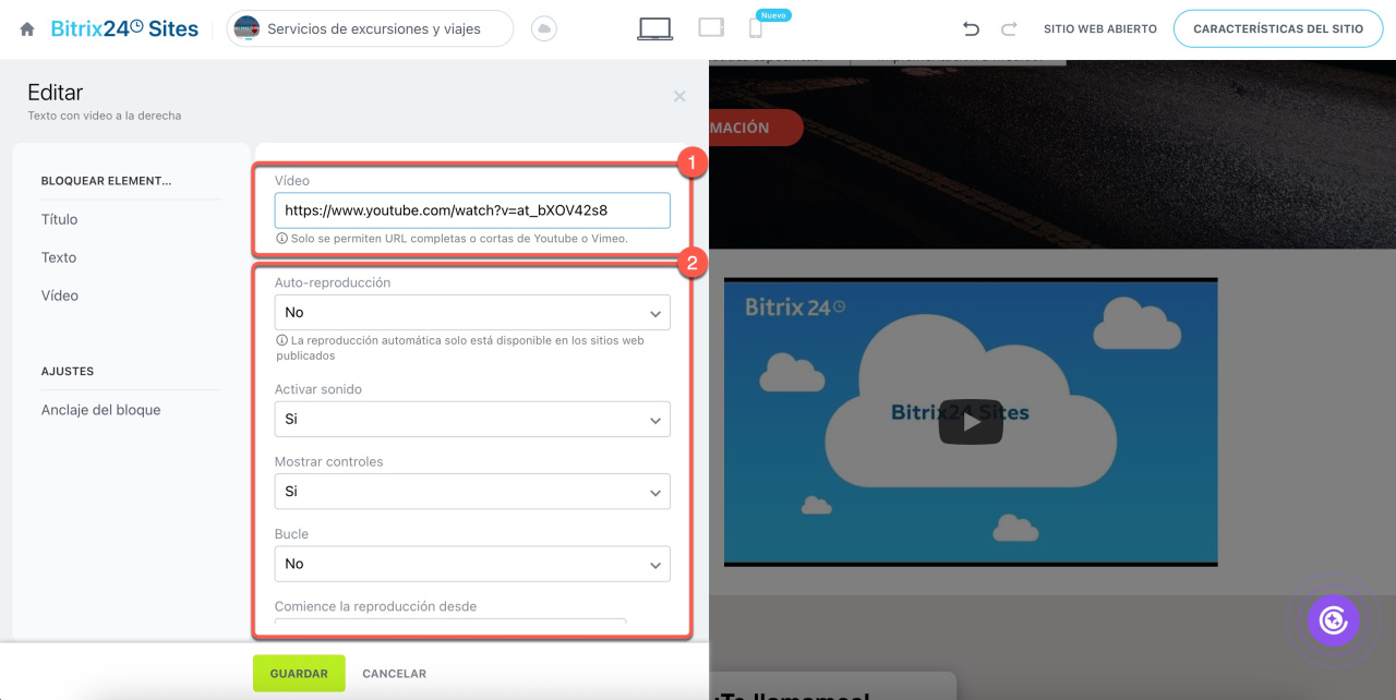 Pegar el enlace del video. En el campo Video, pega la URL de YouTube que copiaste antes. Aquí también puedes ajustar parámetros relacionados con la reproducción.