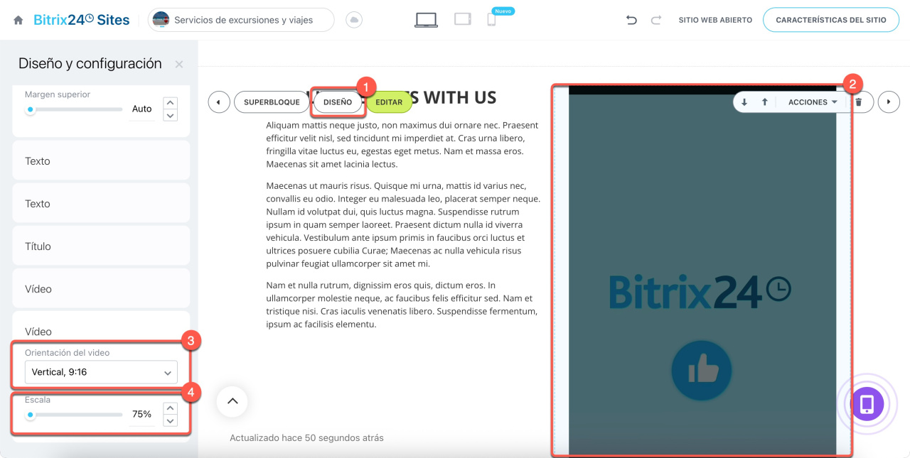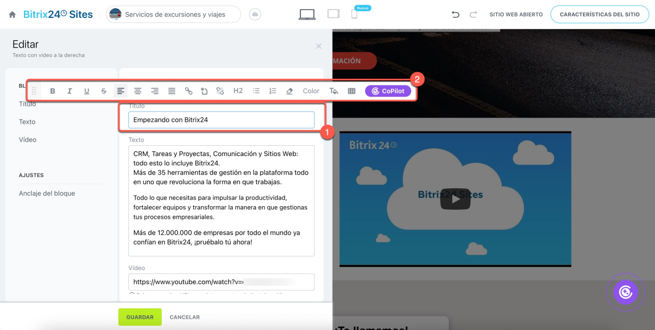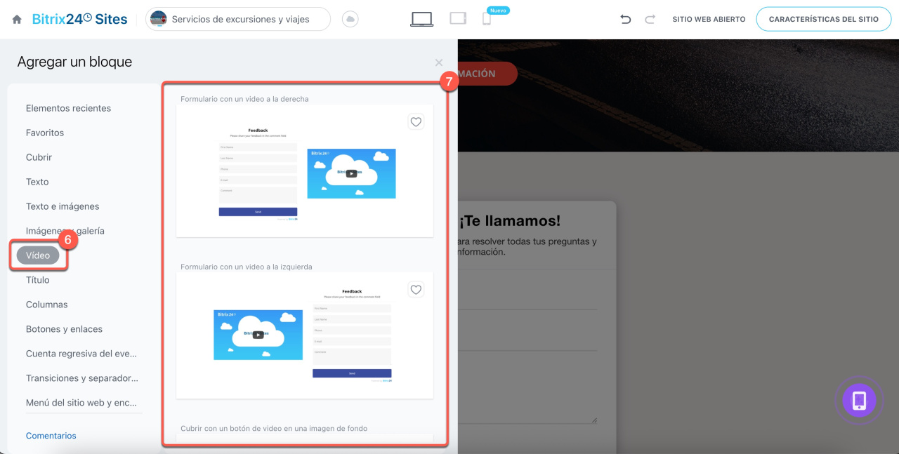 En los sitios web creados con Bitrix24, puedes integrar contenido multimedia de diversas fuentes, incluyendo tanto videos largos como Shorts de YouTube. Incorporar reseñas de productos, tutoriales, testimonios u otros formatos de video hará que tu sitio web sea más dinámico, útil y atractivo para los visitantes.