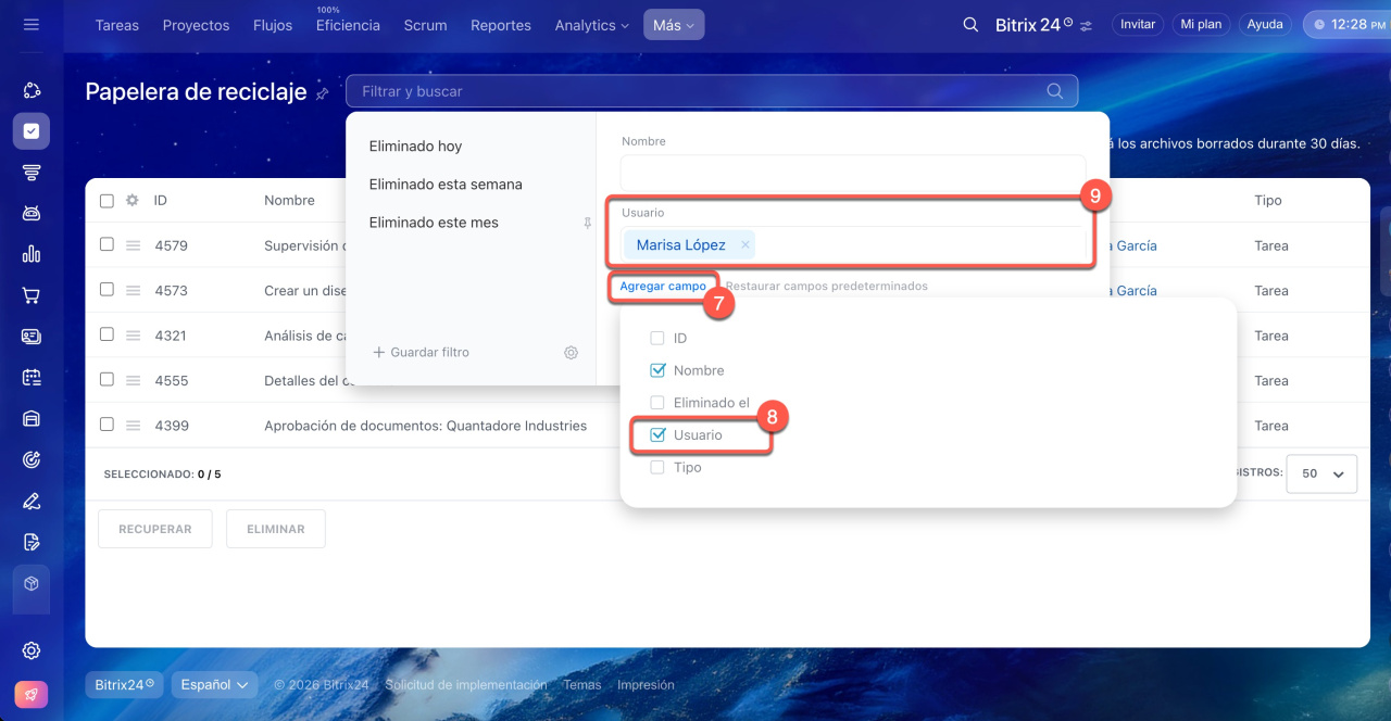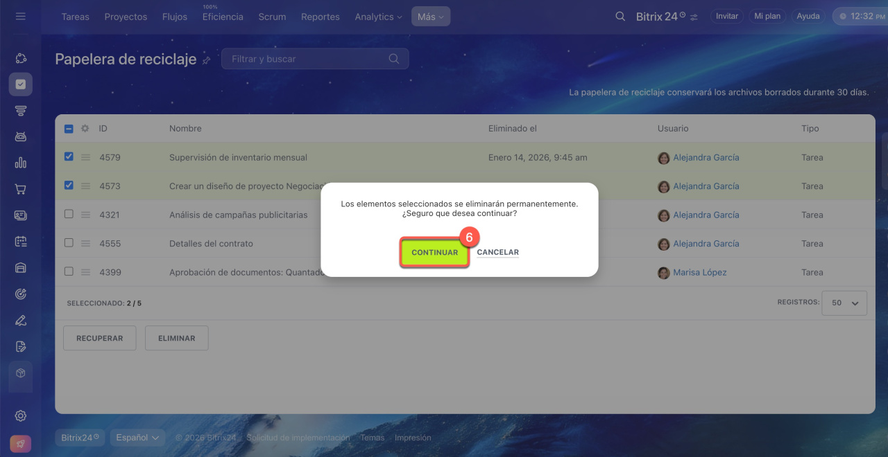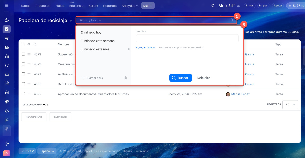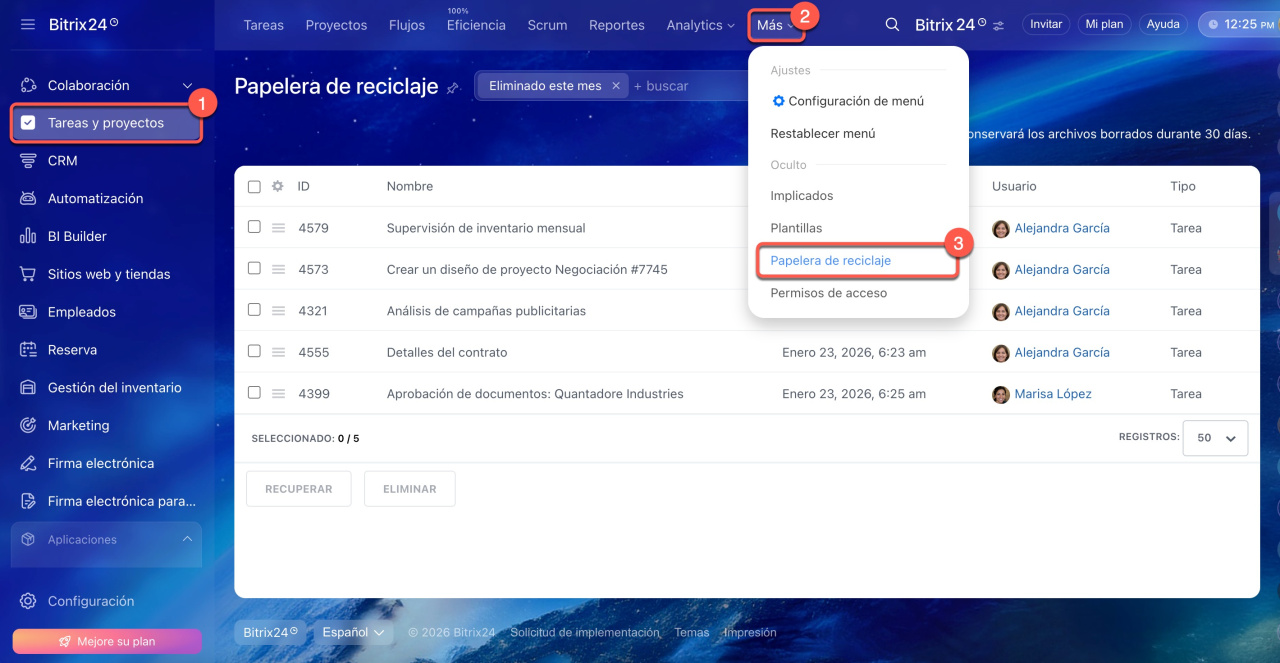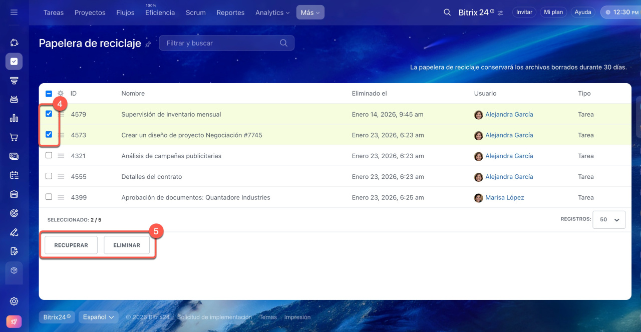 - Las tareas eliminadas en Bitrix24 se almacenan en la papelera de reciclaje durante 30 días antes de su eliminación automática permanente. Durante este período, las tareas pueden restaurarse o eliminarse definitivamente.