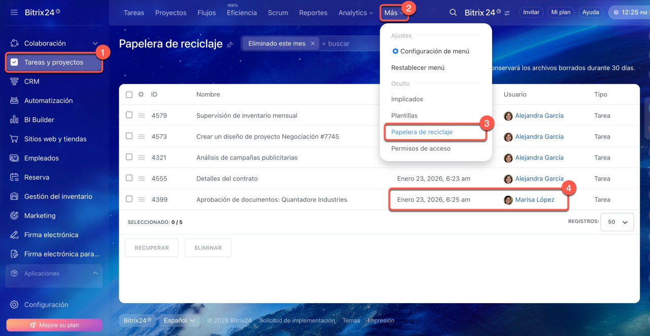 1-4. Ve a Tareas y proyectos > Más > Papelera de reciclaje. Se mostrará la lista de tareas eliminadas, incluyendo información sobre quién y cuándo las eliminó.