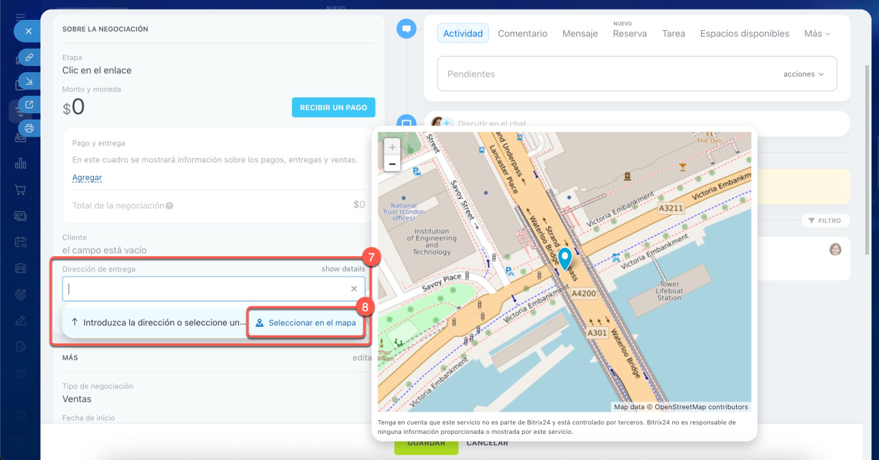 En Bitrix24 puedes utilizar tanto OpenStreetMap como Google Maps para gestionar entregas y registrar direcciones de clientes en el CRM. Esta funcionalidad te permite visualizar de forma clara la ubicación de tus clientes y ayuda a los responsables a completar los datos de contacto en las fichas del CRM.