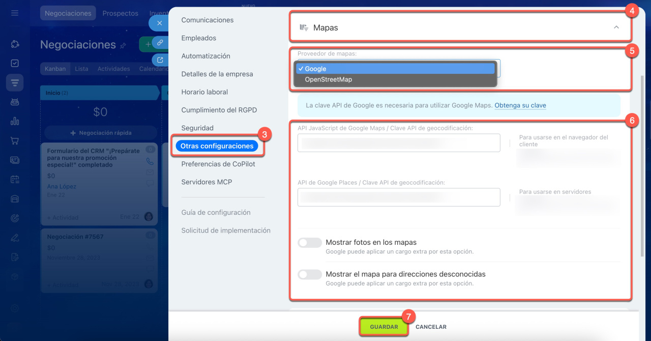Por defecto, Bitrix24 utiliza OpenStreetMap, pero puedes configurar Google Maps si lo necesitas.