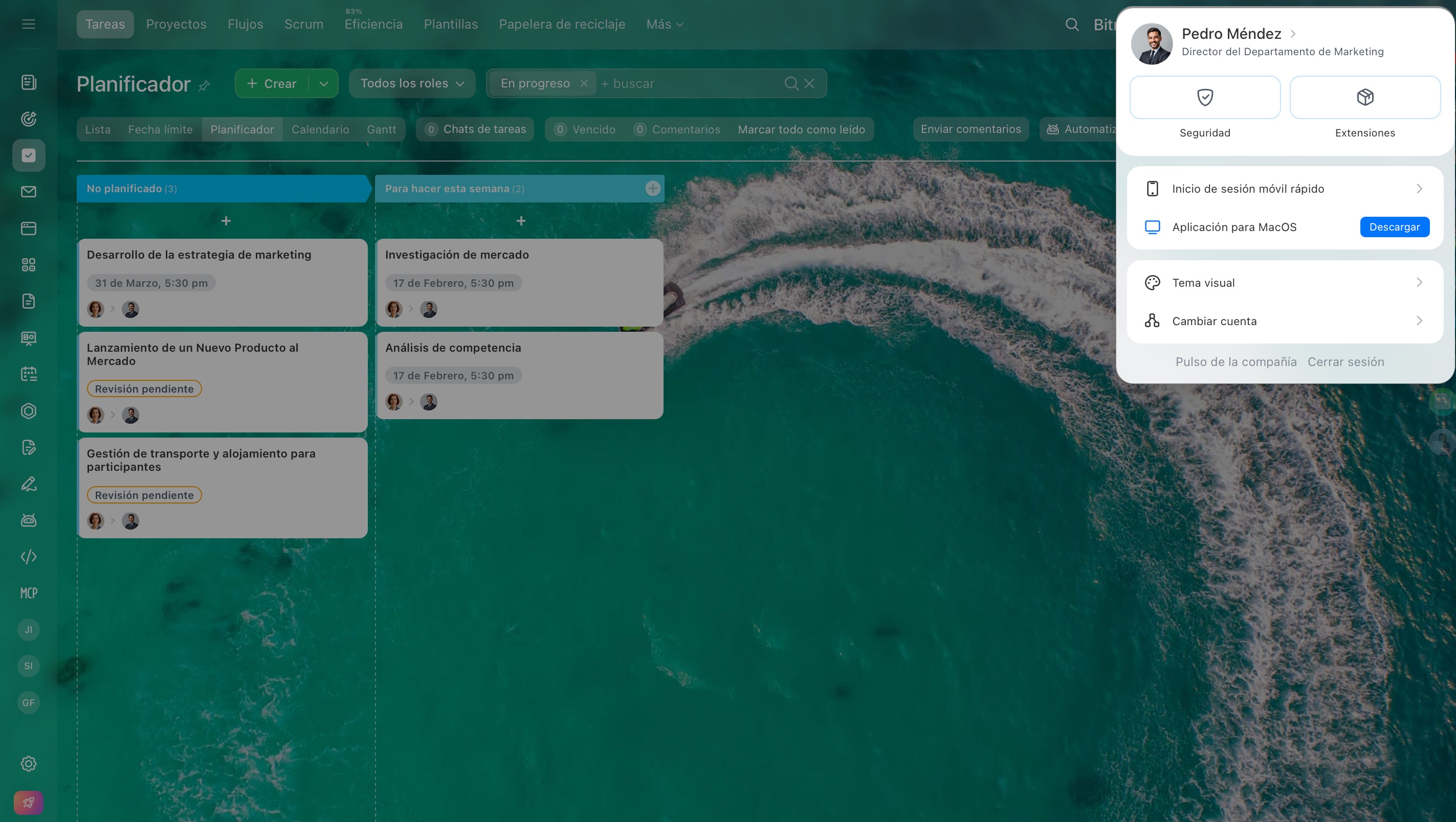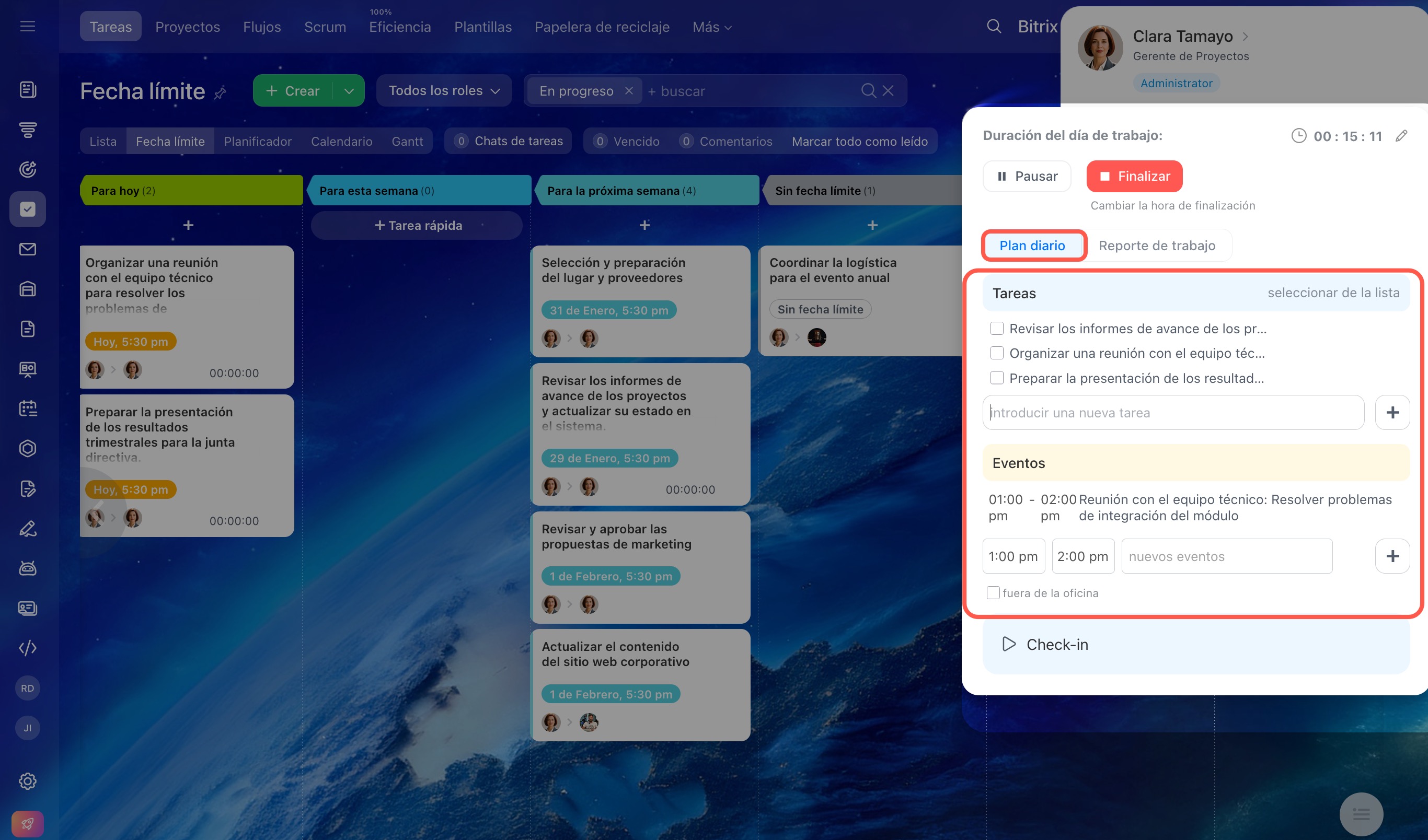 En la pestaña Plan diario se muestran las tareas y reuniones programadas para hoy. Si es necesario, puedes agregar nuevos eventos y tareas directamente.