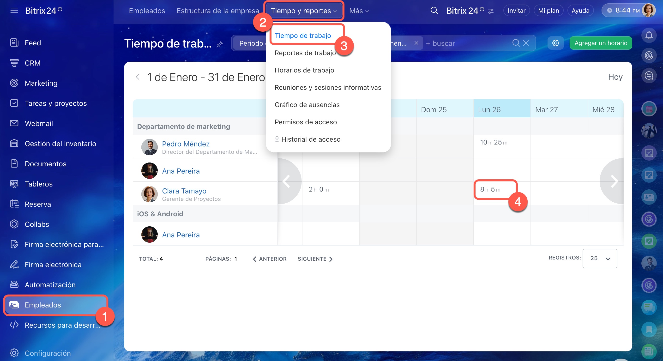 La sección Empleados en Bitrix24 te permite registrar el tiempo de trabajo, configurar horarios y revisar informes laborales. Este artículo responde a las preguntas más frecuentes sobre la gestión de empleados y el control de su tiempo de trabajo.