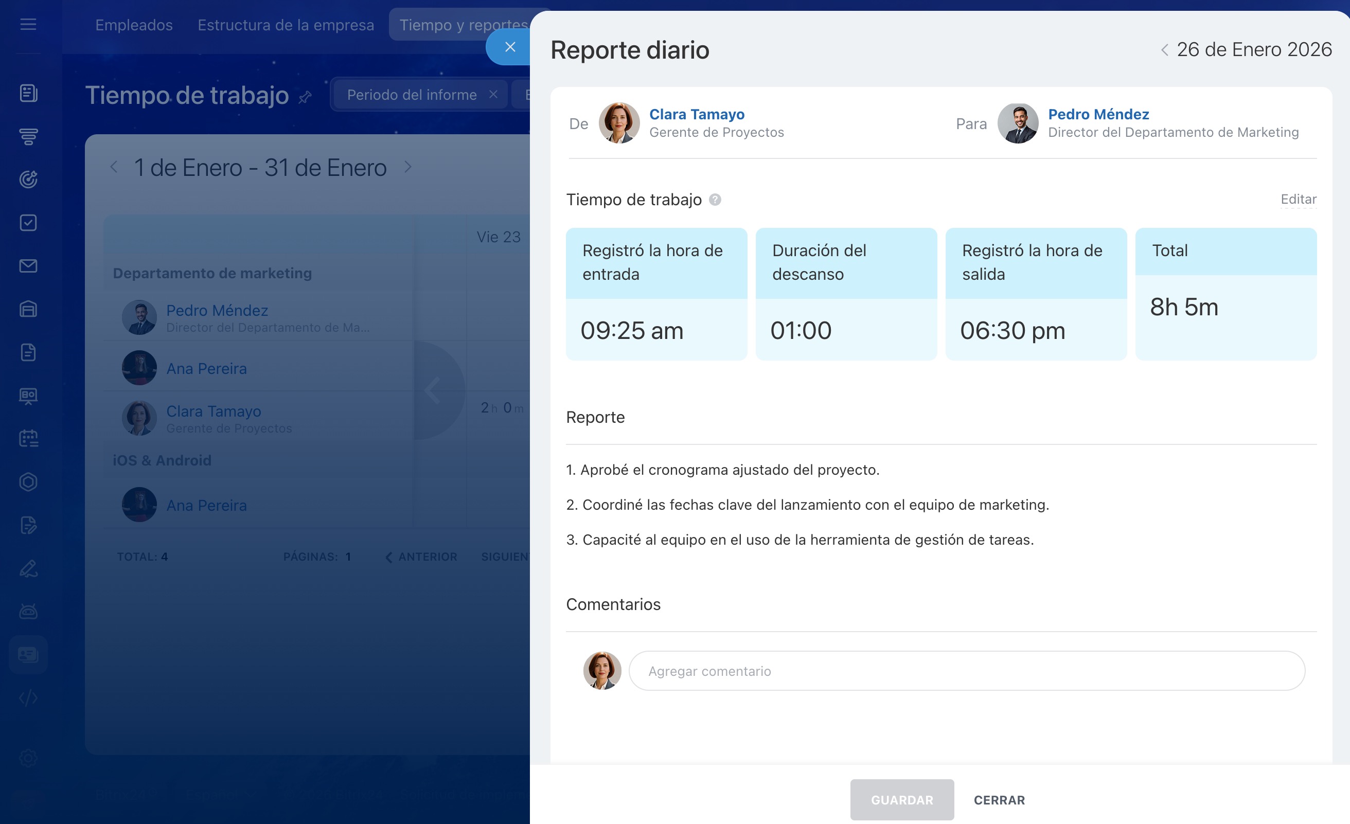 - Supervisor del departamento: Además de sus propios datos, puede ver y editar la jornada laboral y los reportes de sus subordinados.