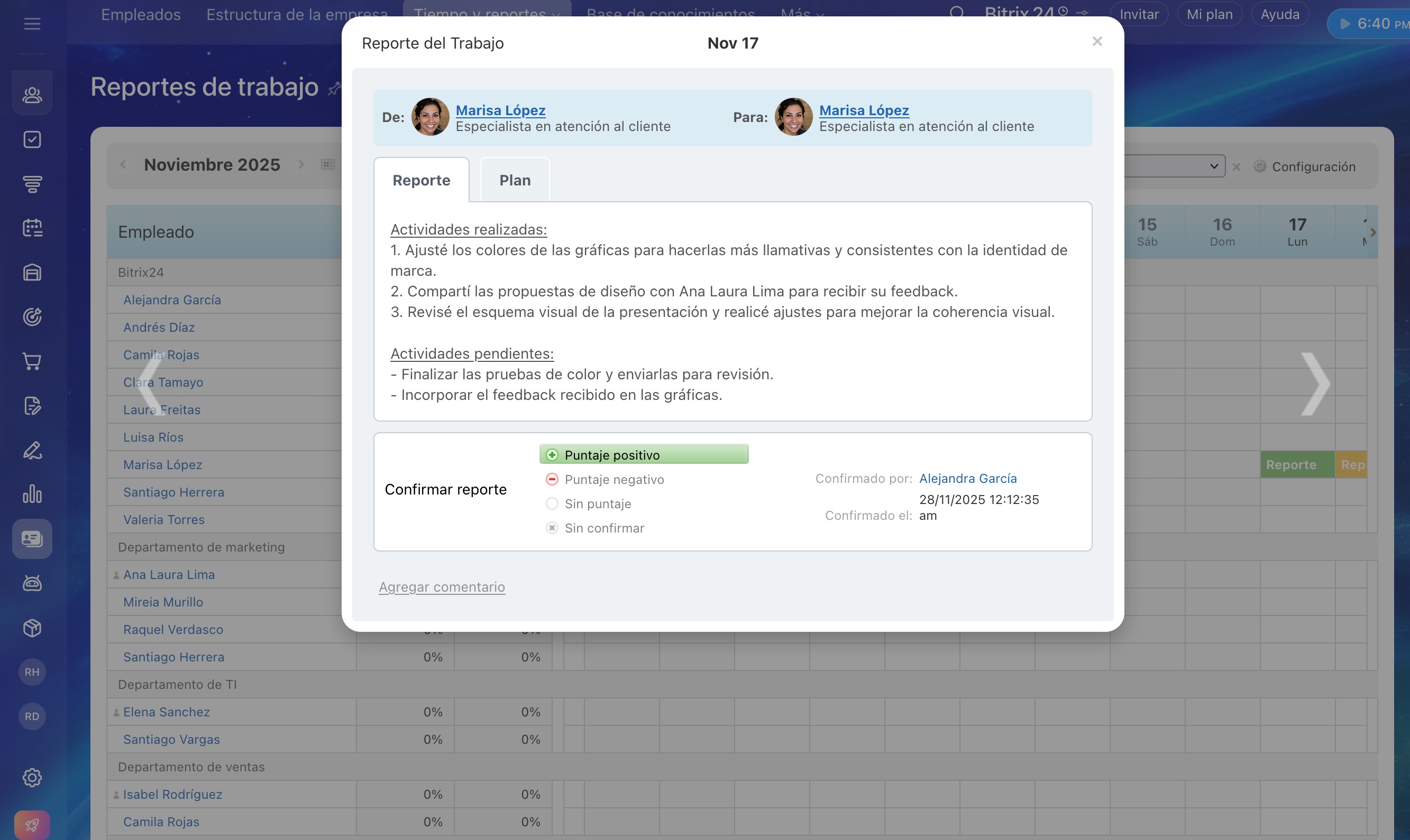 Después de enviar el reporte de trabajo, el supervisor puede revisarlo y calificarlo. Puedes encontrar los informes en la sección Empleados > Tiempo y reportes > Reportes de trabajo.