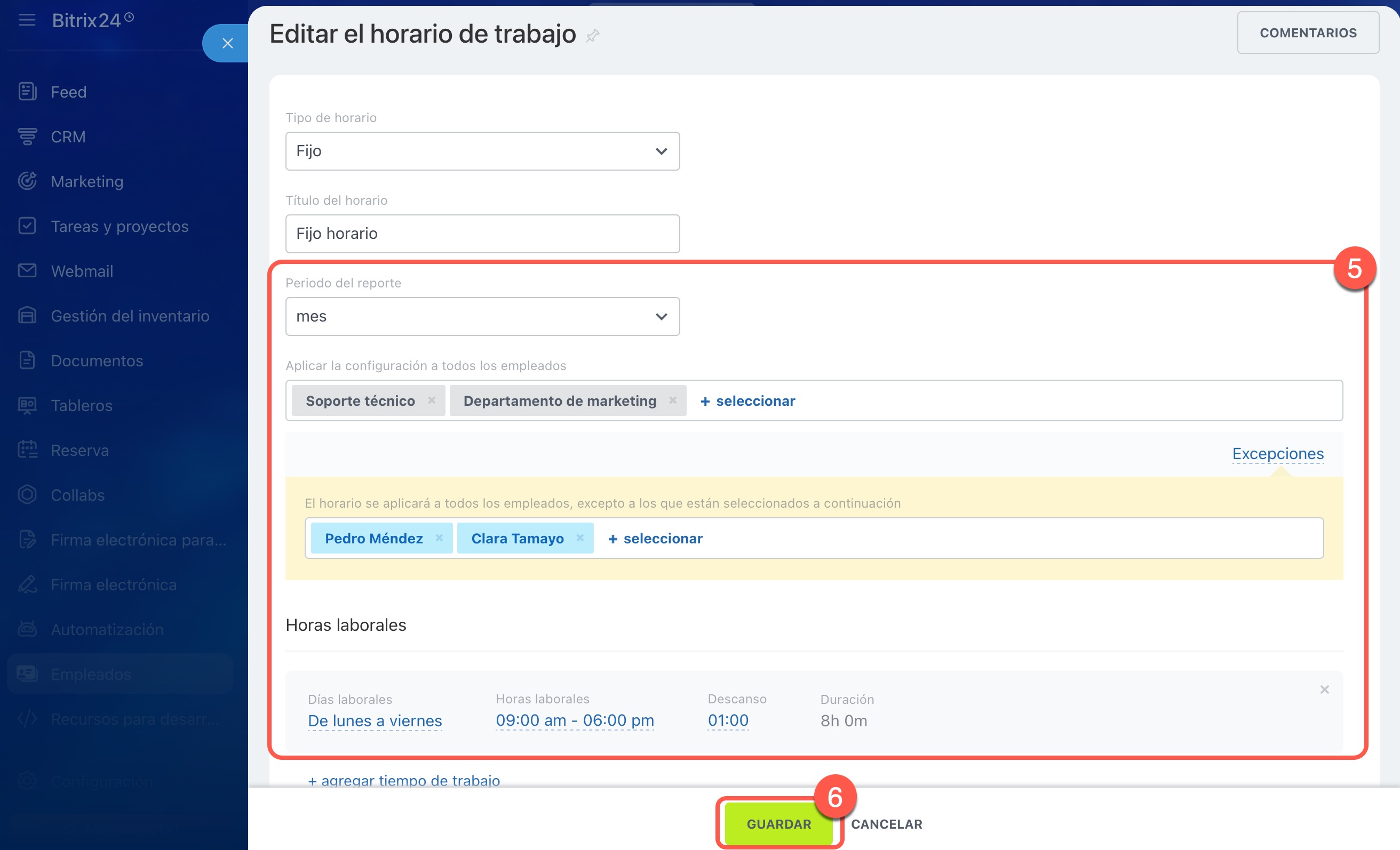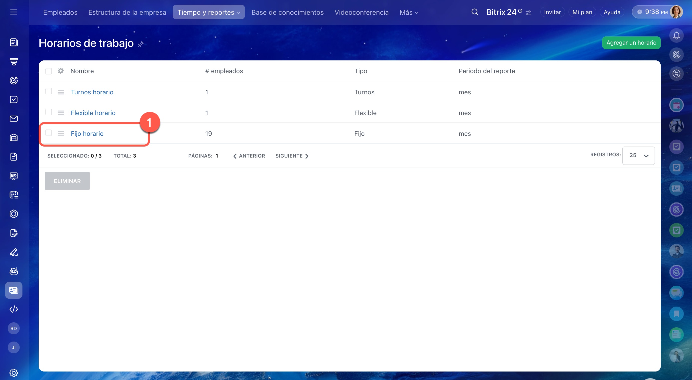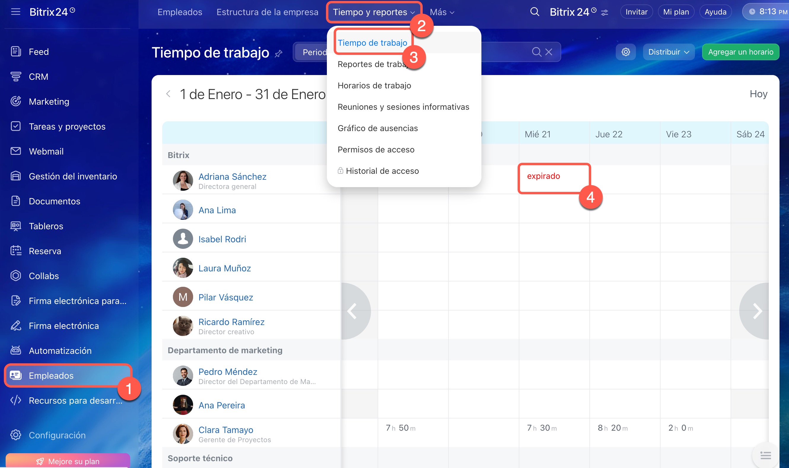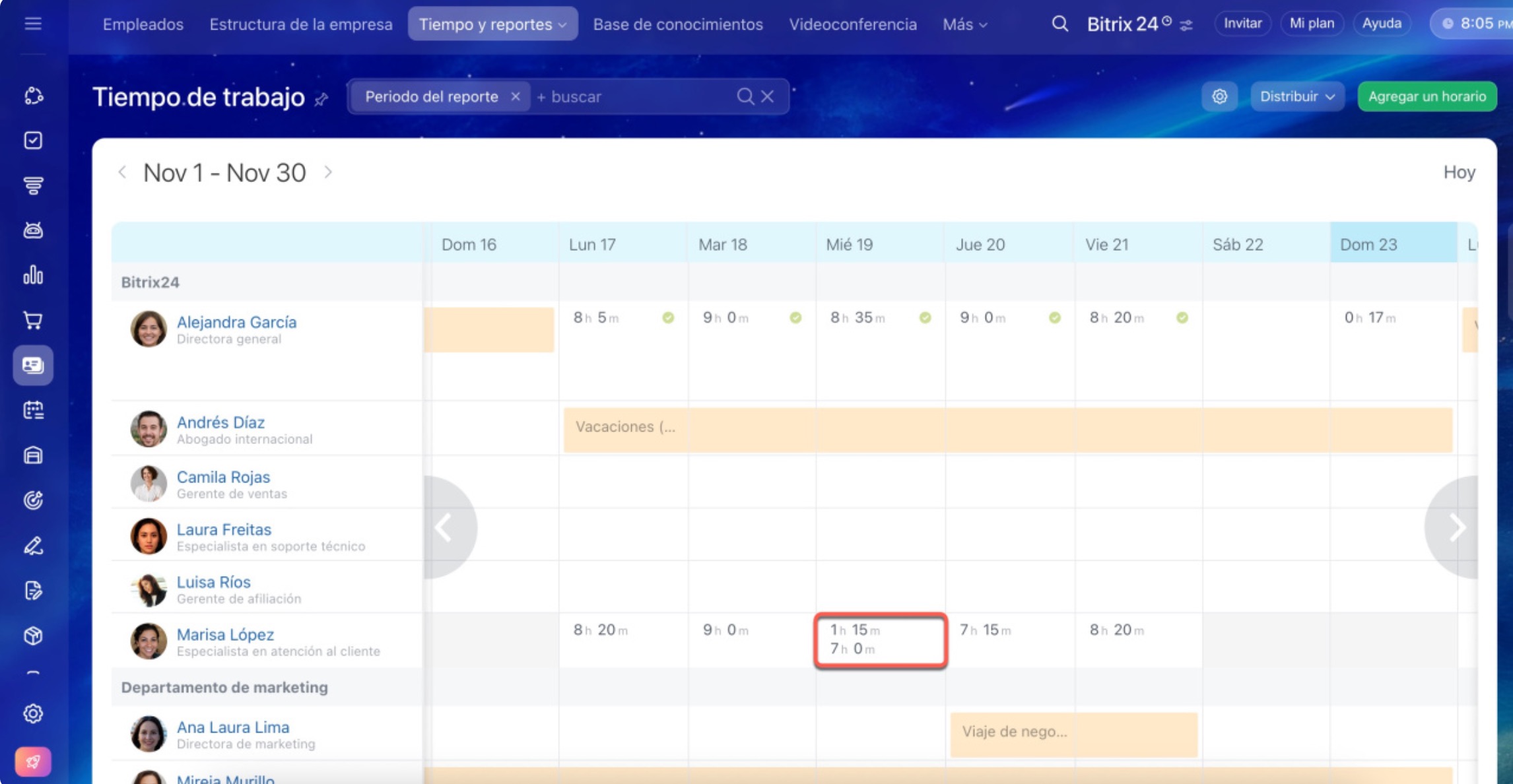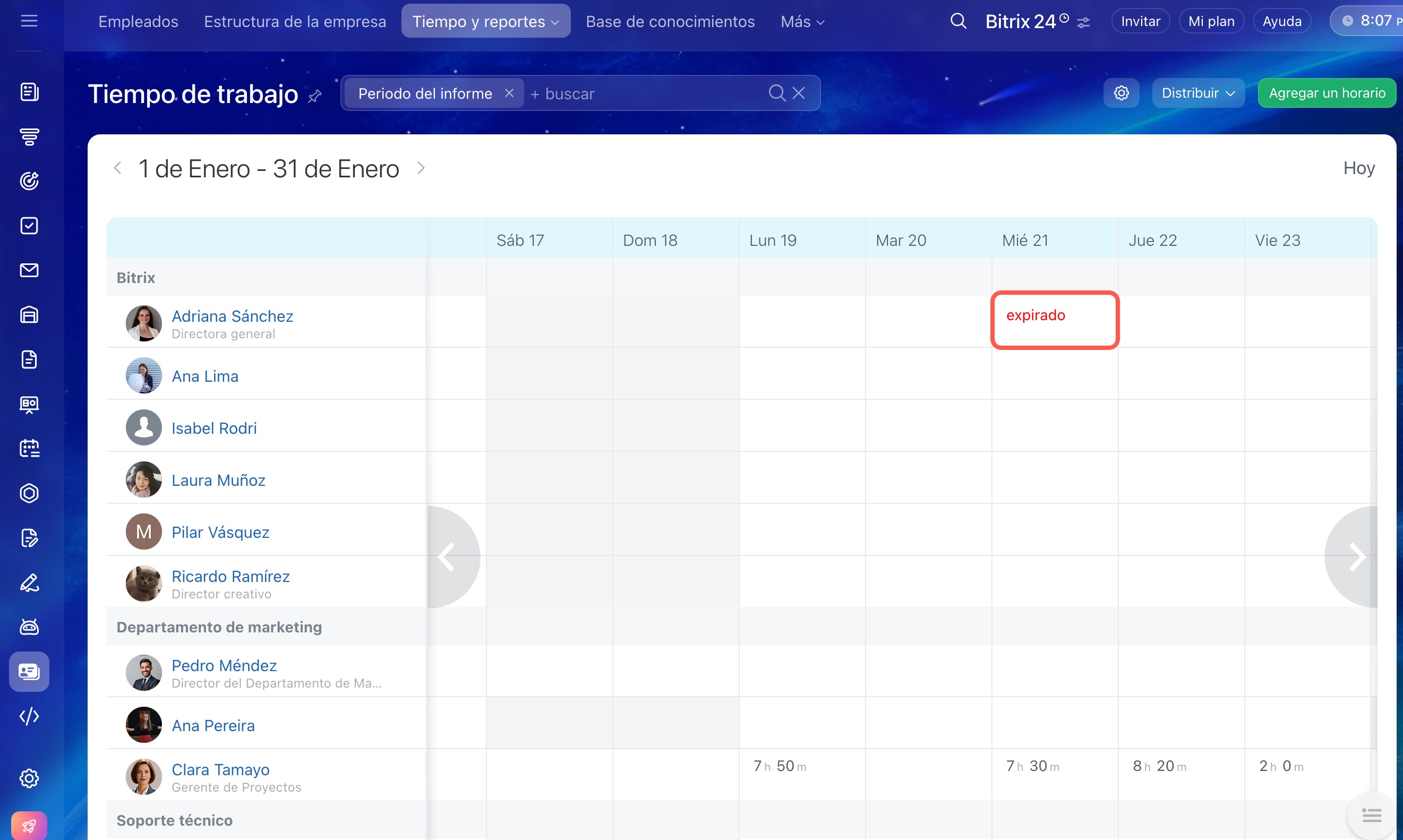 Solución: En la sección Empleados > Tiempo y reportes > Horarios de trabajo, el supervisor o administrador de Bitrix24 debe verificar: