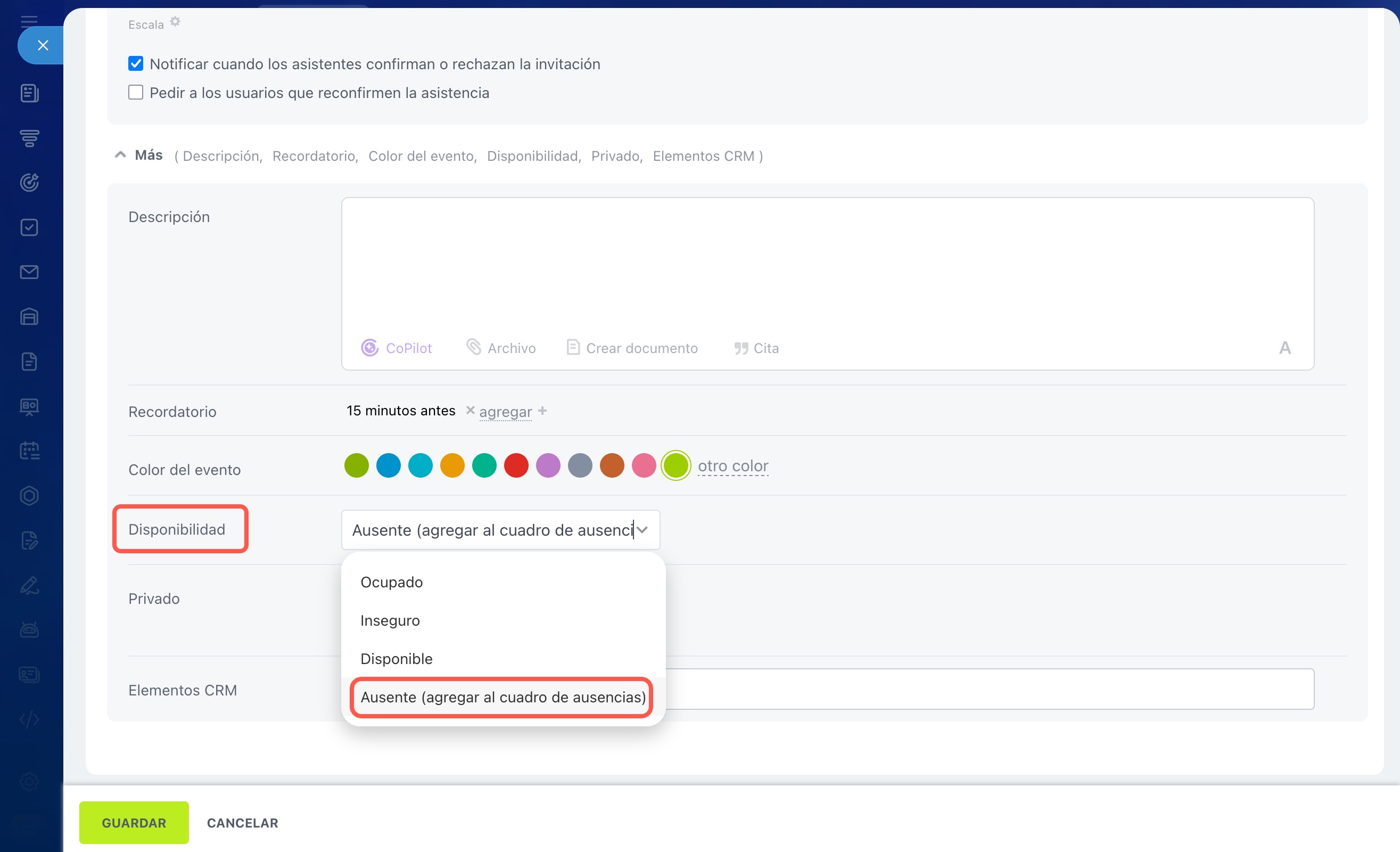 Calendario: Crea un evento en el calendario. En el campo Disponibilidad, selecciona Ausente (Agregar al cuadro de ausencias).