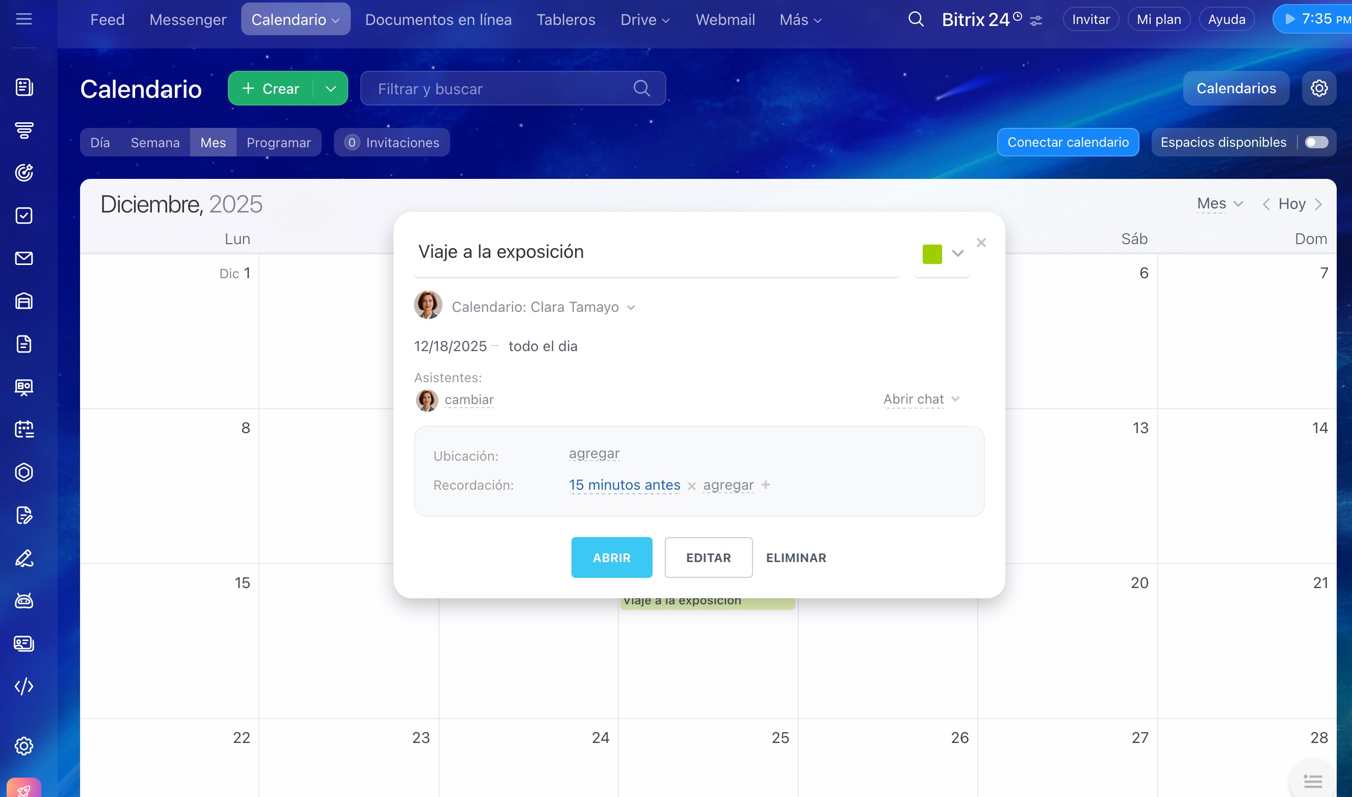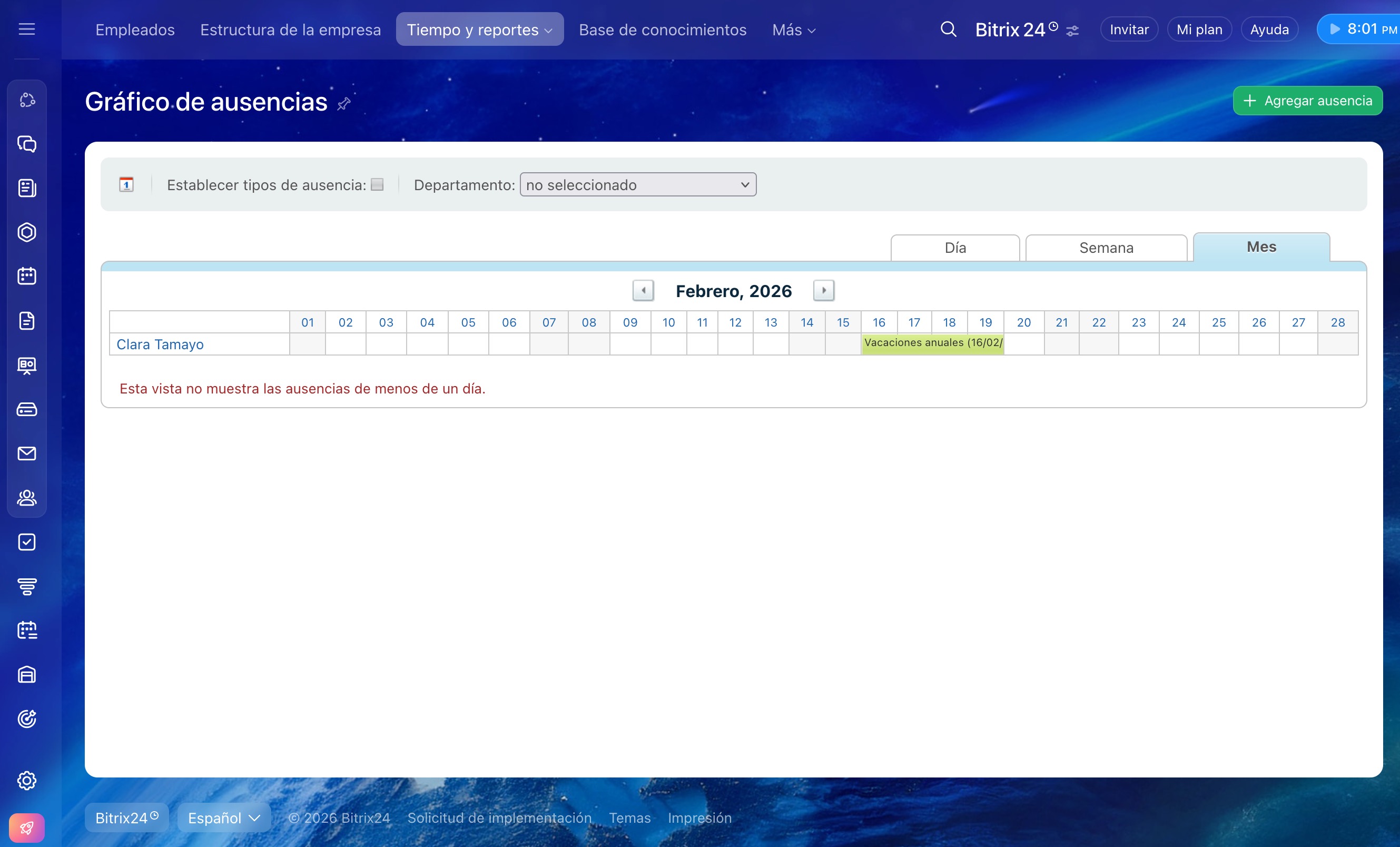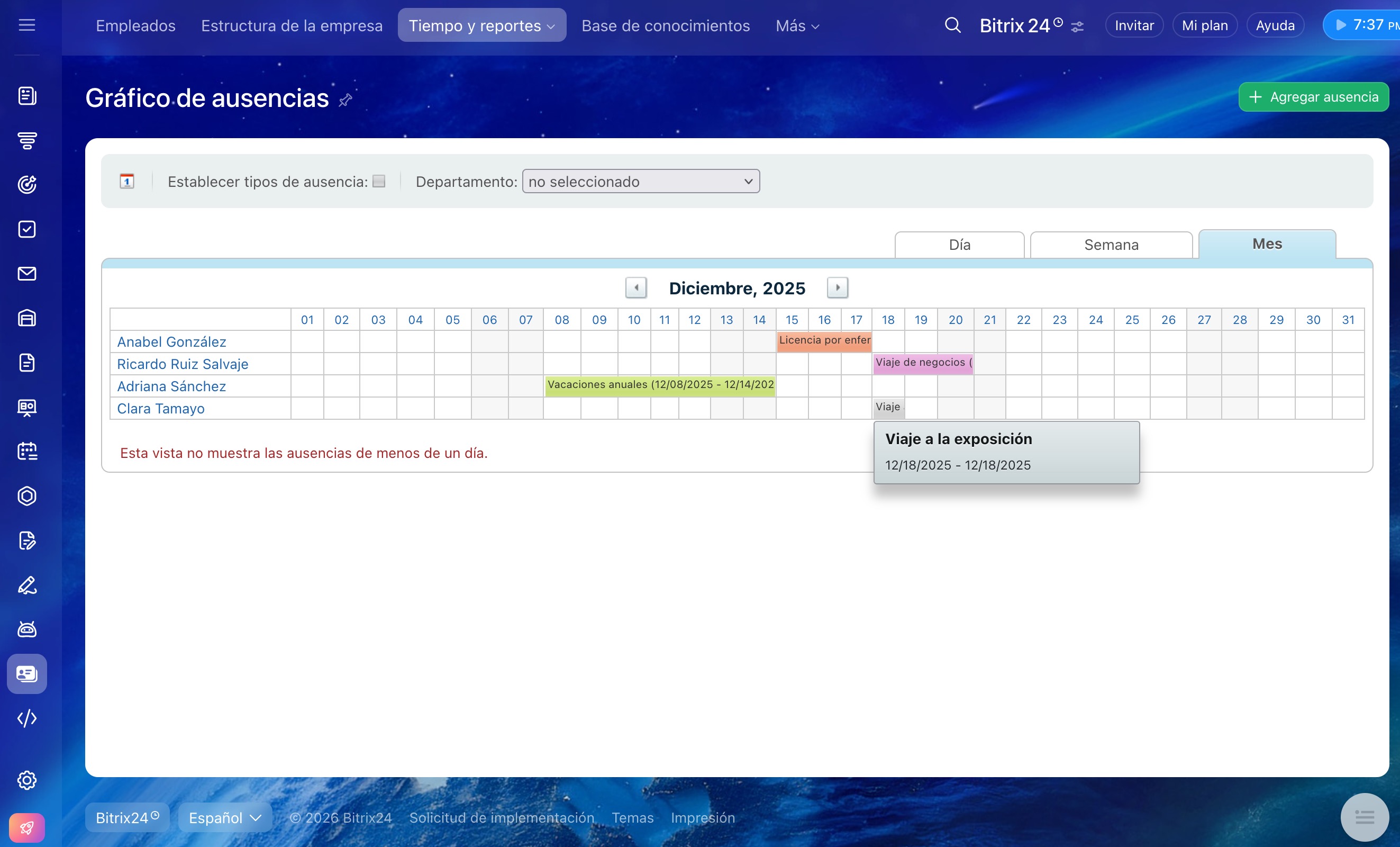 En la versión en la nube de Bitrix24, solo el administrador puede añadir ausencias al gráfico. Los empleados pueden agregar ausencias mediante un evento en el calendario o un flujo de trabajo.