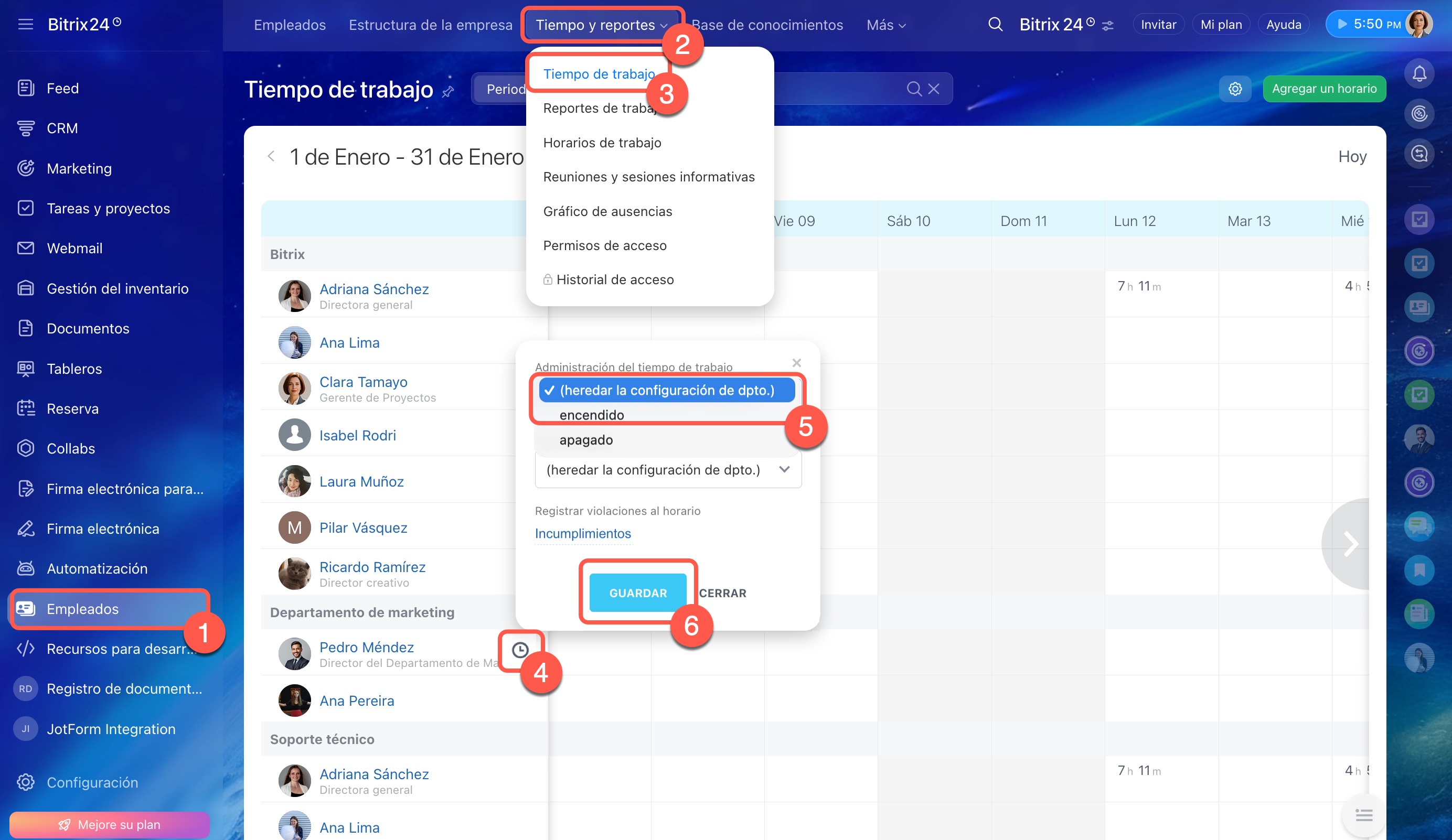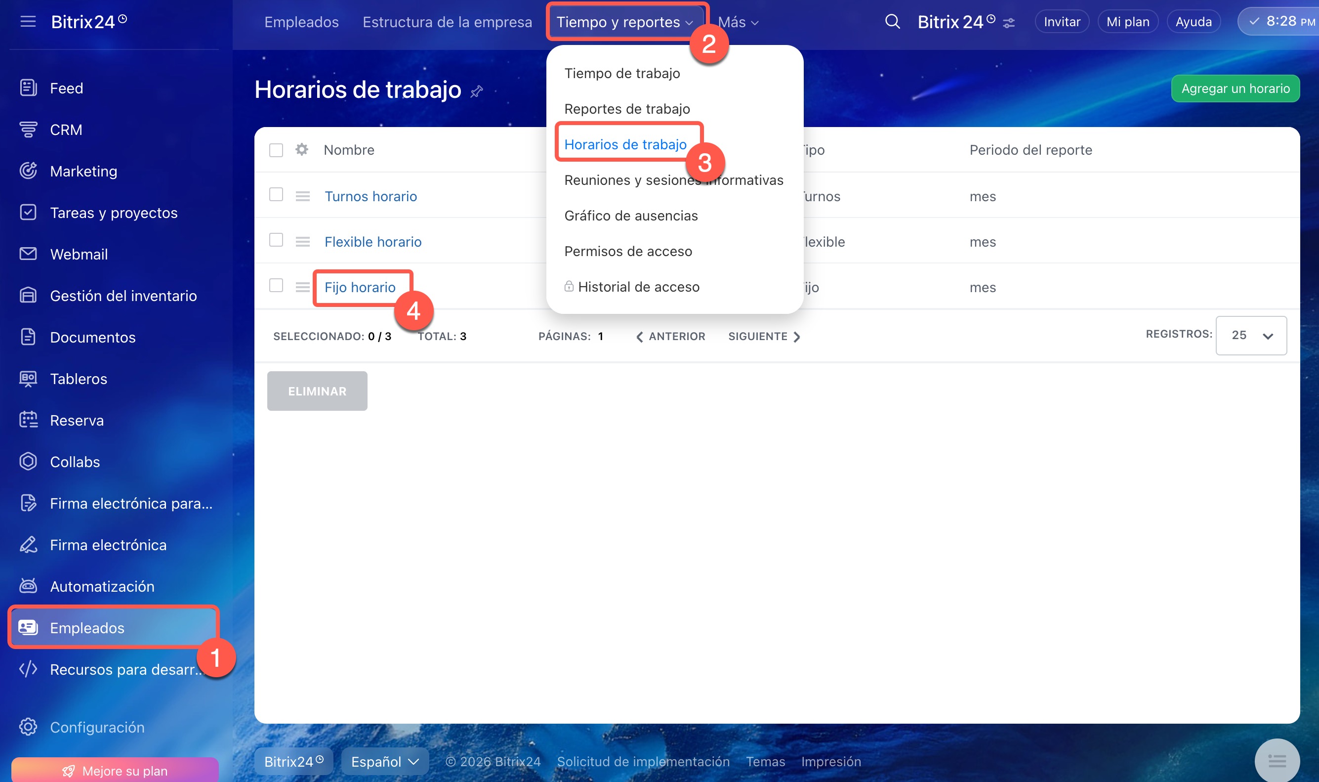 1–3. Ve a la sección Empleados > Tiempo y reportes > Horarios de trabajo.