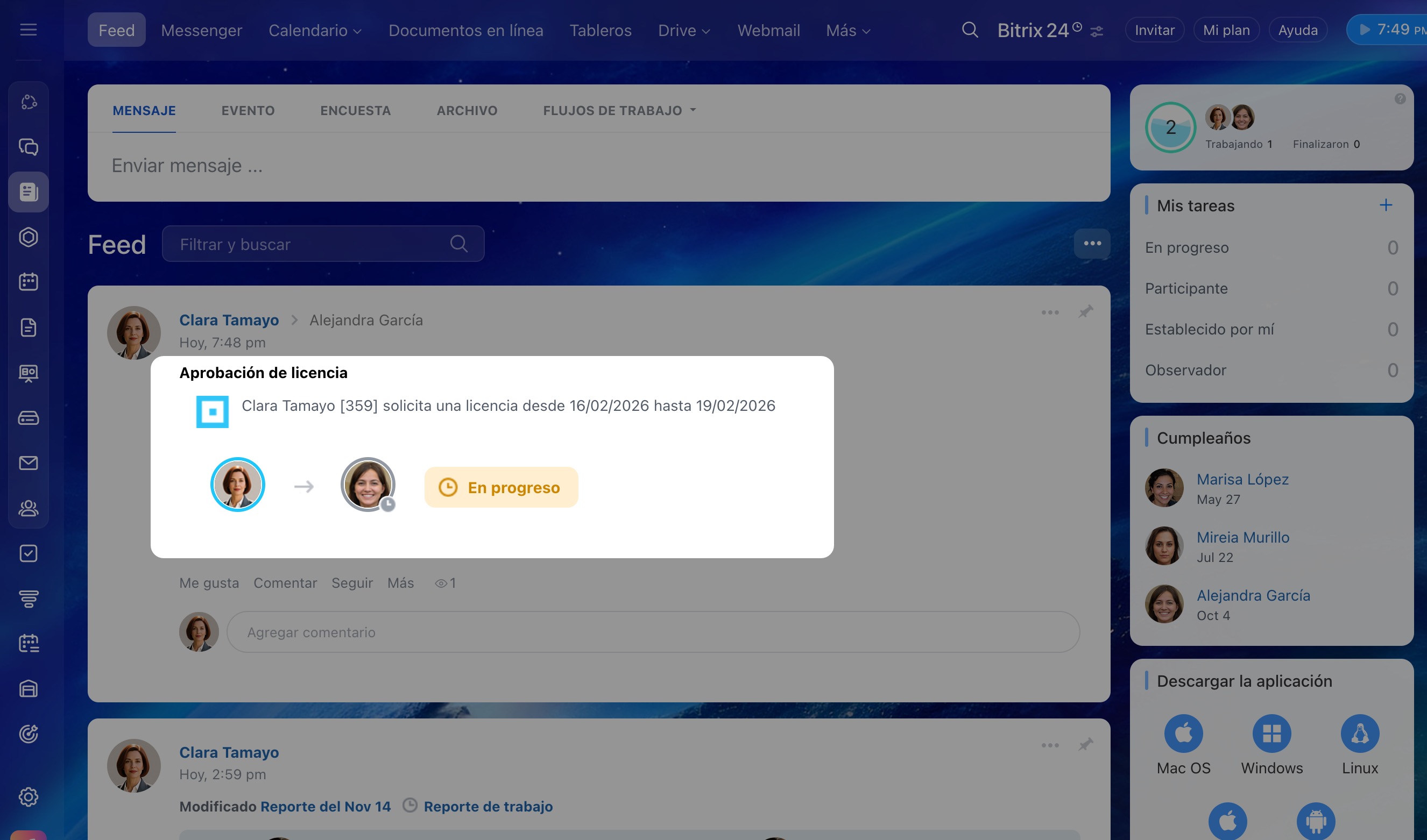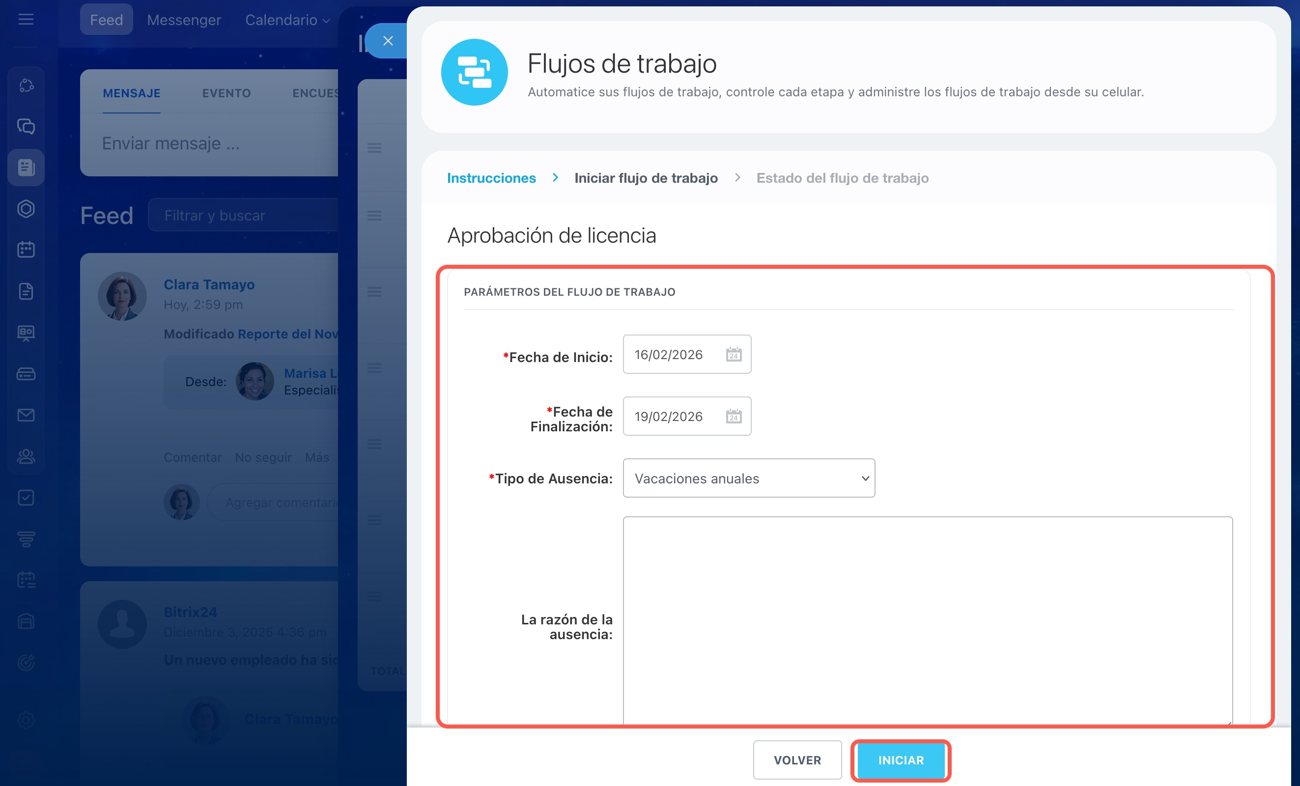 Flujo de trabajo: Haz clic en Feed > Más > Flujos de trabajo. Selecciona un flujo, por ejemplo, Aprobación de licencia, y ejecútalo. Una vez aprobado el flujo de trabajo, la ausencia se mostrará en el gráfico.