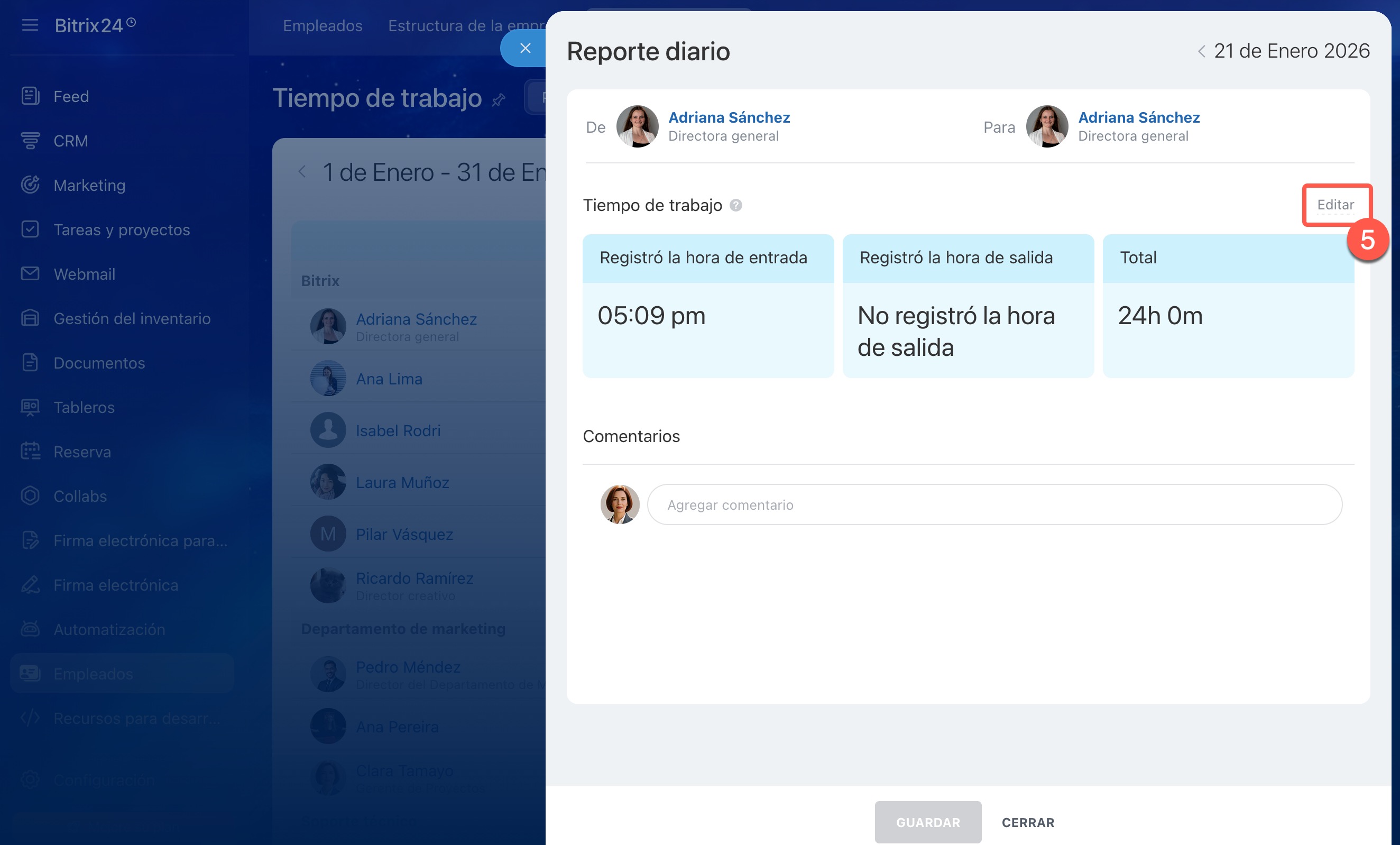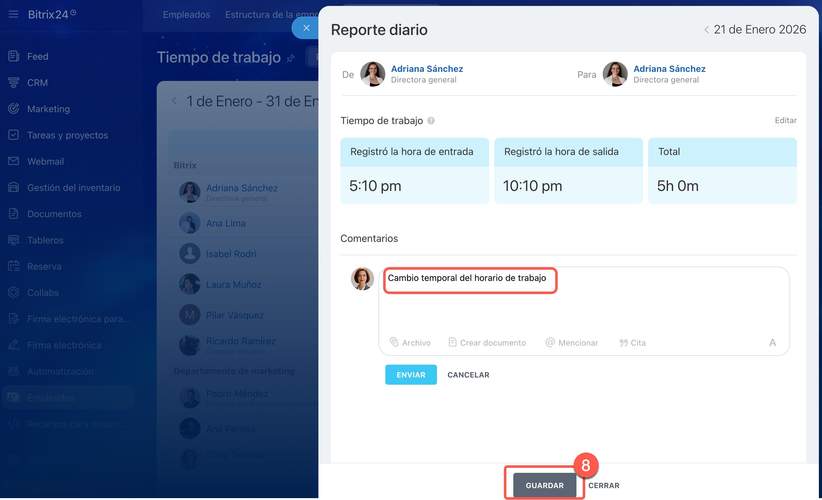 Soluciones: Corrige el tiempo de trabajo y verifica la configuración del horario. El empleado solo puede modificar su propio tiempo de trabajo. El supervisor o administrador de Bitrix24 puede modificar el tiempo de trabajo del empleado y la configuración del horario laboral.