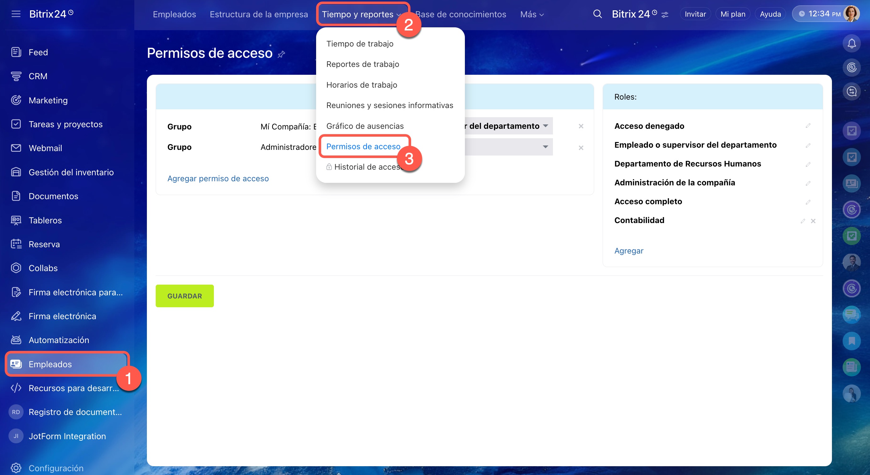 2–3. Haz clic en Tiempo e reportes > Permisos de acceso.