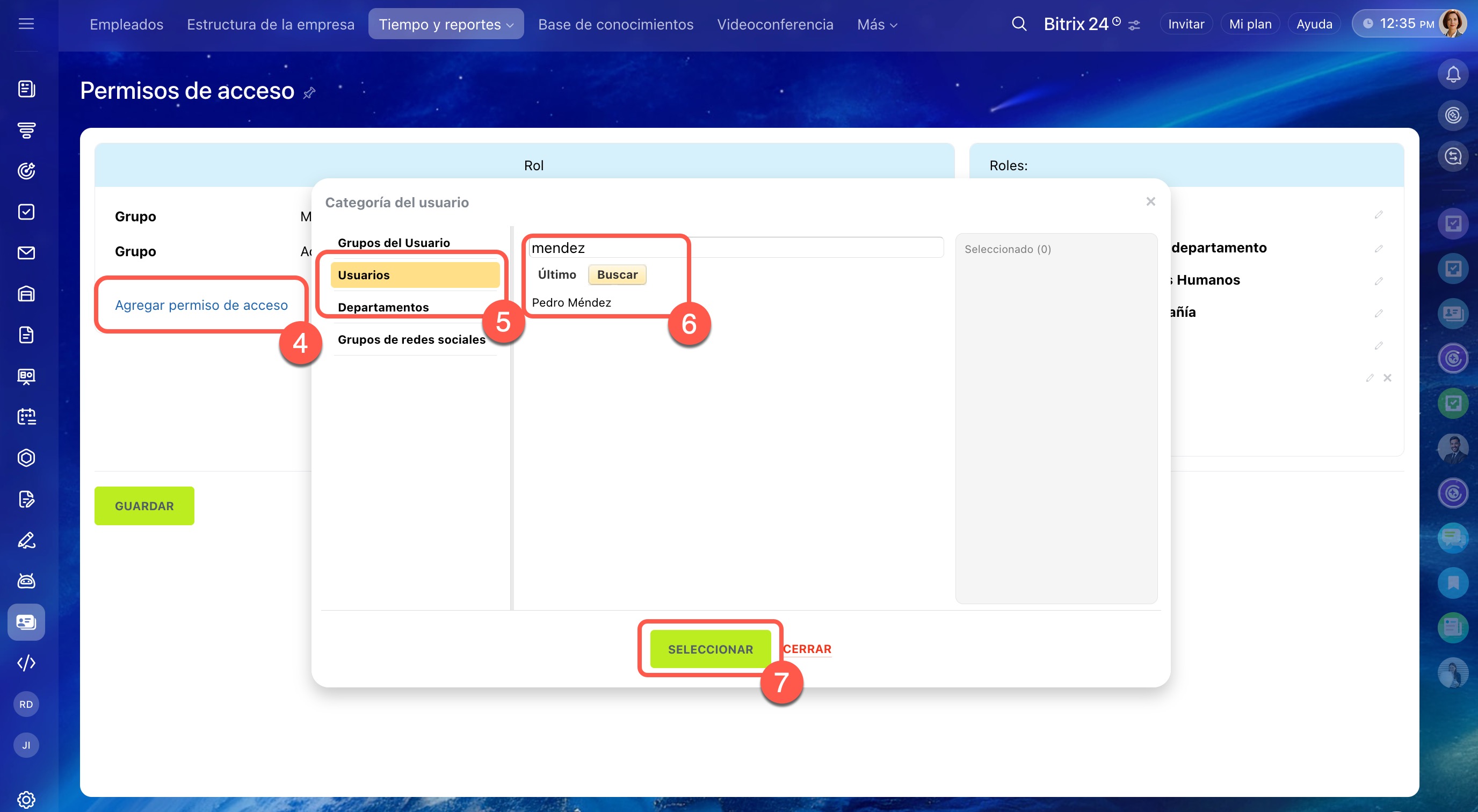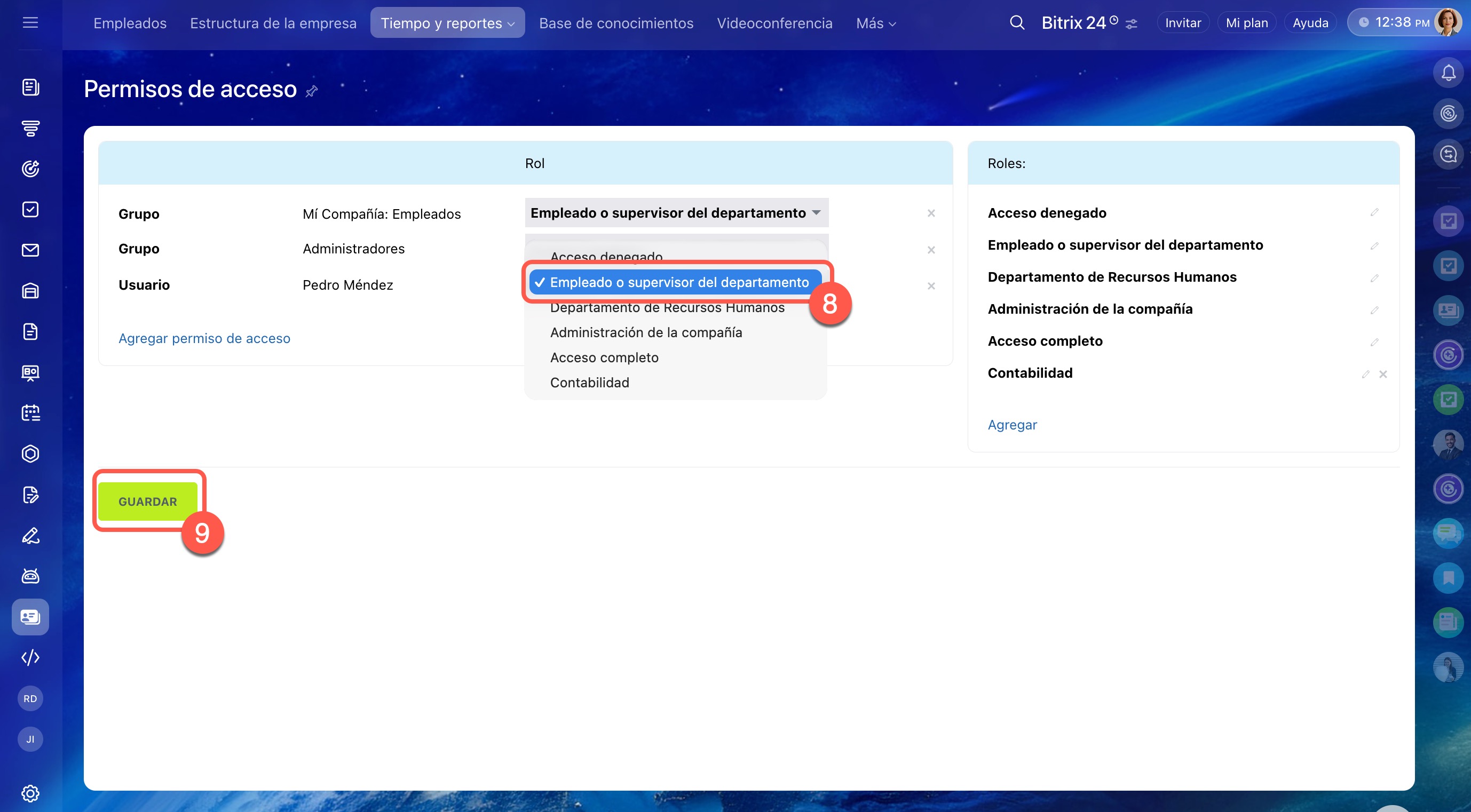8. Selecciona el permiso de acceso Empleado o supervisor del departamento. Este permiso funciona de manera diferente según el rol del usuario en la estructura de la empresa: