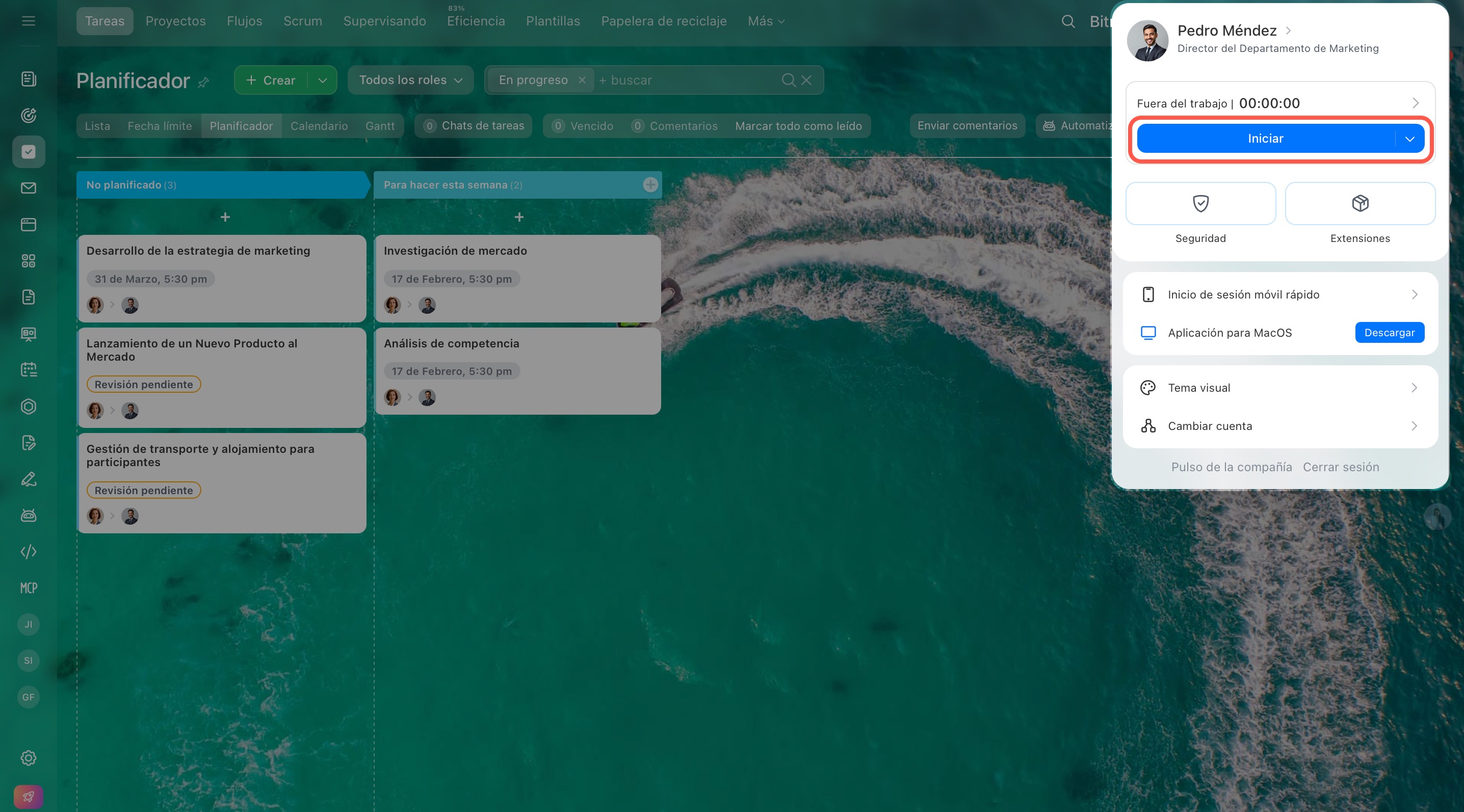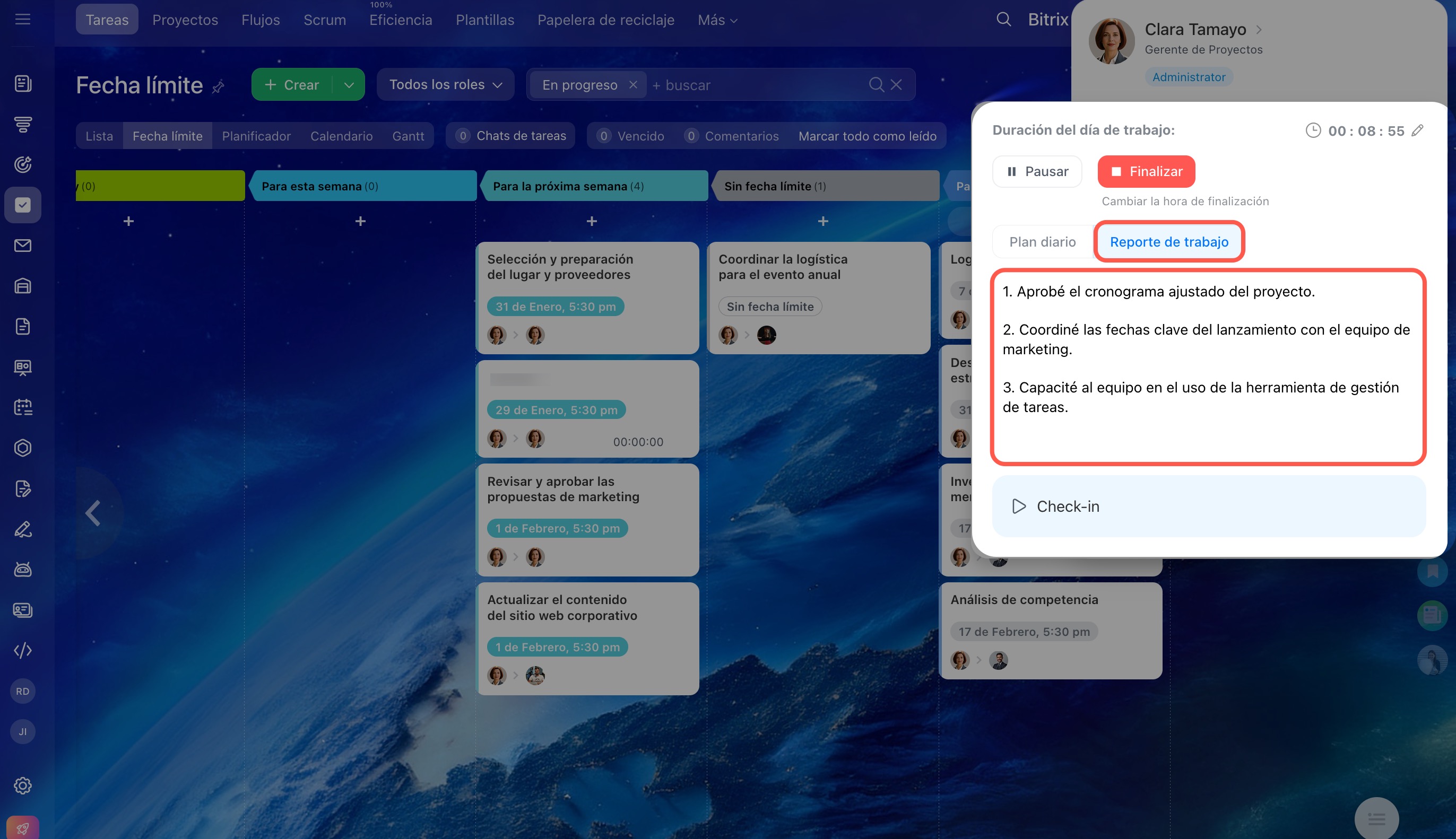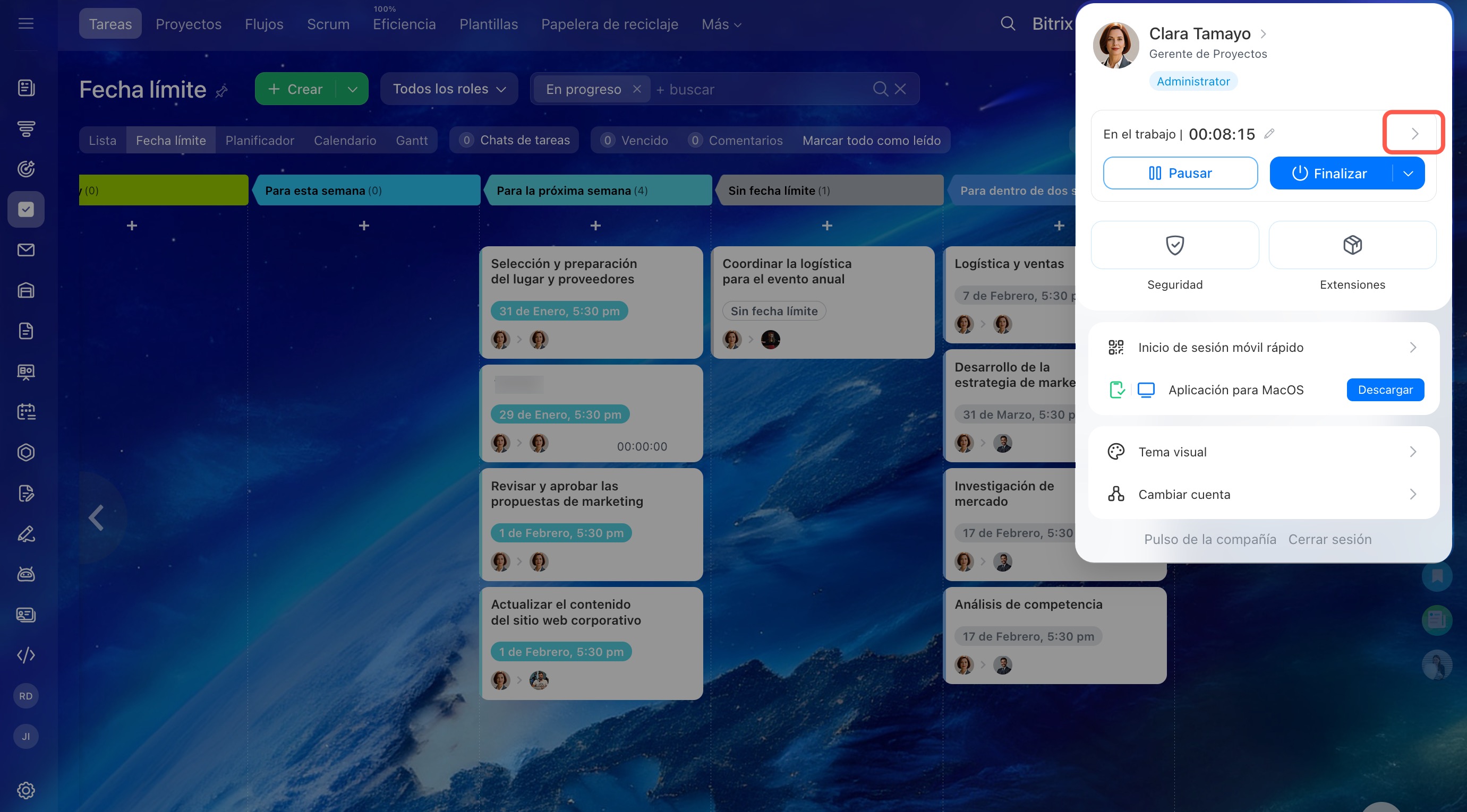 El seguimiento solo está disponible si la opción Tiempo y reportes está activada en la configuración de tu Bitrix24.