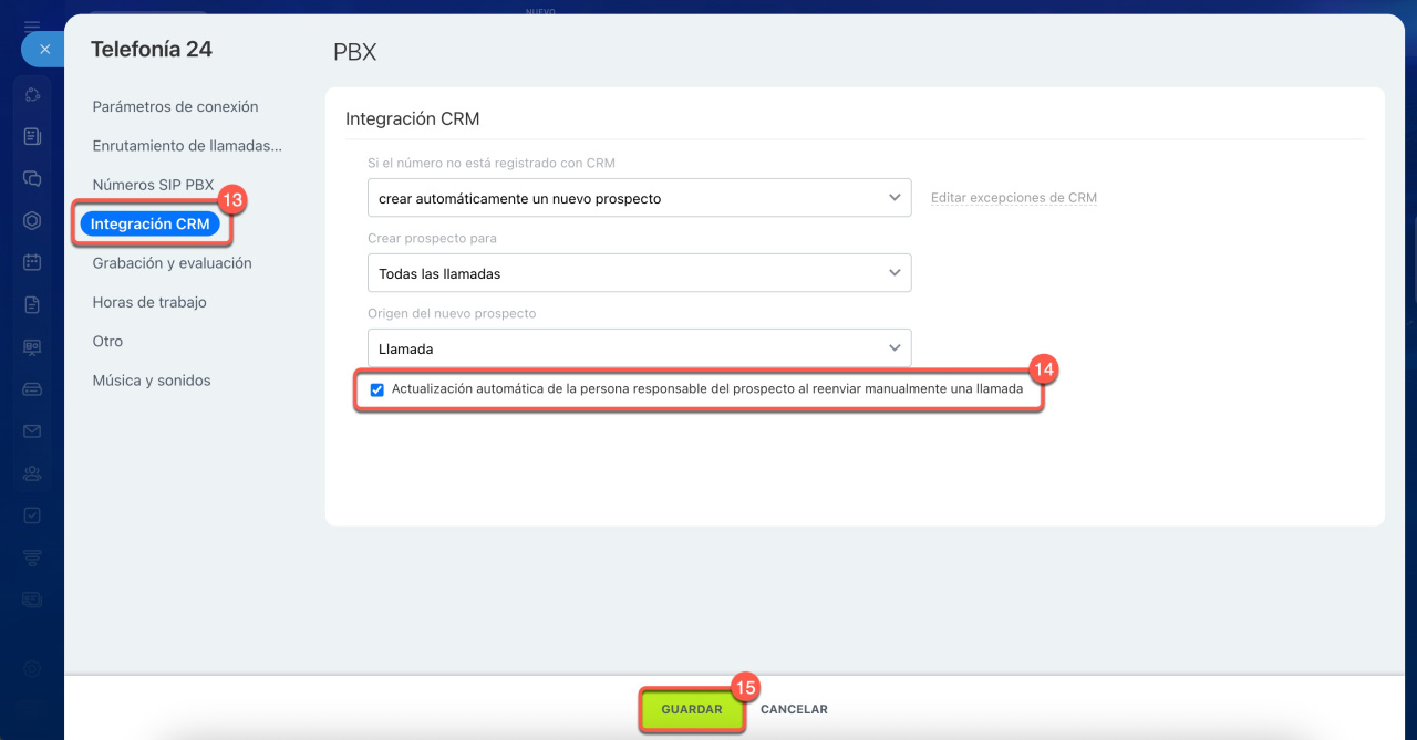 14. Activa la opción Actualización automática de la persona responsable del prospecto al reenviar manualmente una llamada si quieres que el responsable cambie al reenviar la llamada.