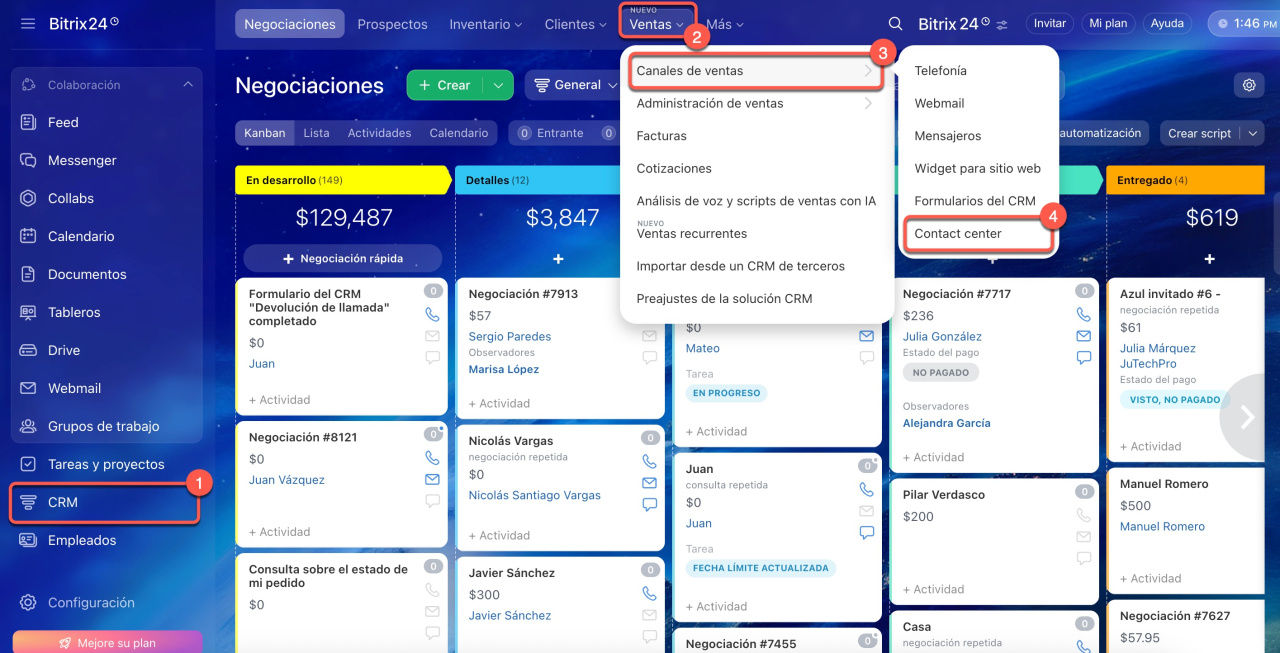 1-4. Ve a CRM > Ventas > Canales de ventas > Contact center.