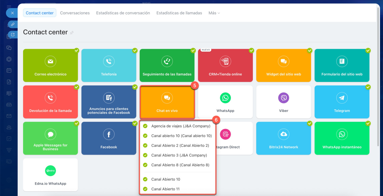 5-6. Haz clic en el canal de comunicación que quieras configurar (por ejemplo, Chat en vivo o Facebook) y selecciona un canal abierto.