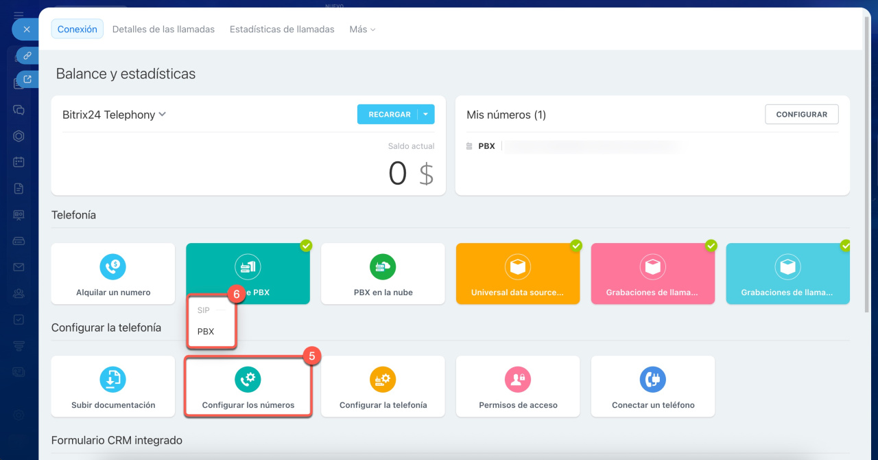 5-6. Haz clic en Configurar los números y selecciona un número alquilado o una PBX.