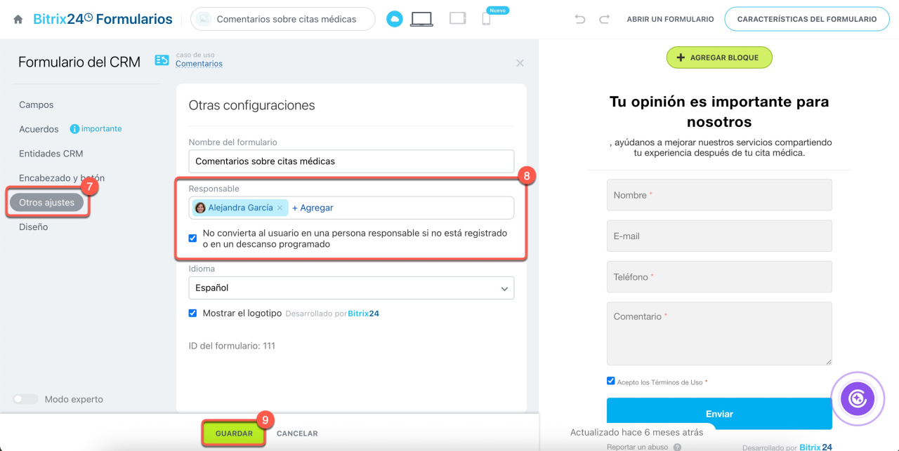 Cuando un cliente envía un formulario del CRM, Bitrix24 crea automáticamente un prospecto, una negociación u otro elemento en el CRM. Esto ayuda a no perder solicitudes y a asignar rápidamente a los empleados responsables.