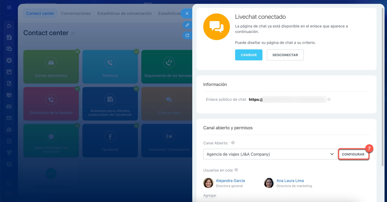 - Para mensajería y redes sociales: Ve a CRM > Ventas > Canales de ventas > Contact center, selecciona el canal abierto y haz clic en Configurar.