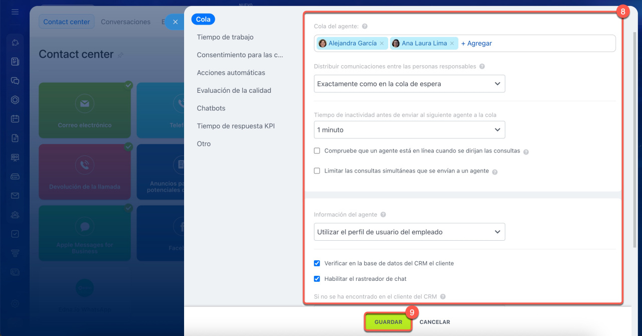 - Cola de agentes: selecciona los usuarios que recibirán las solicitudes.