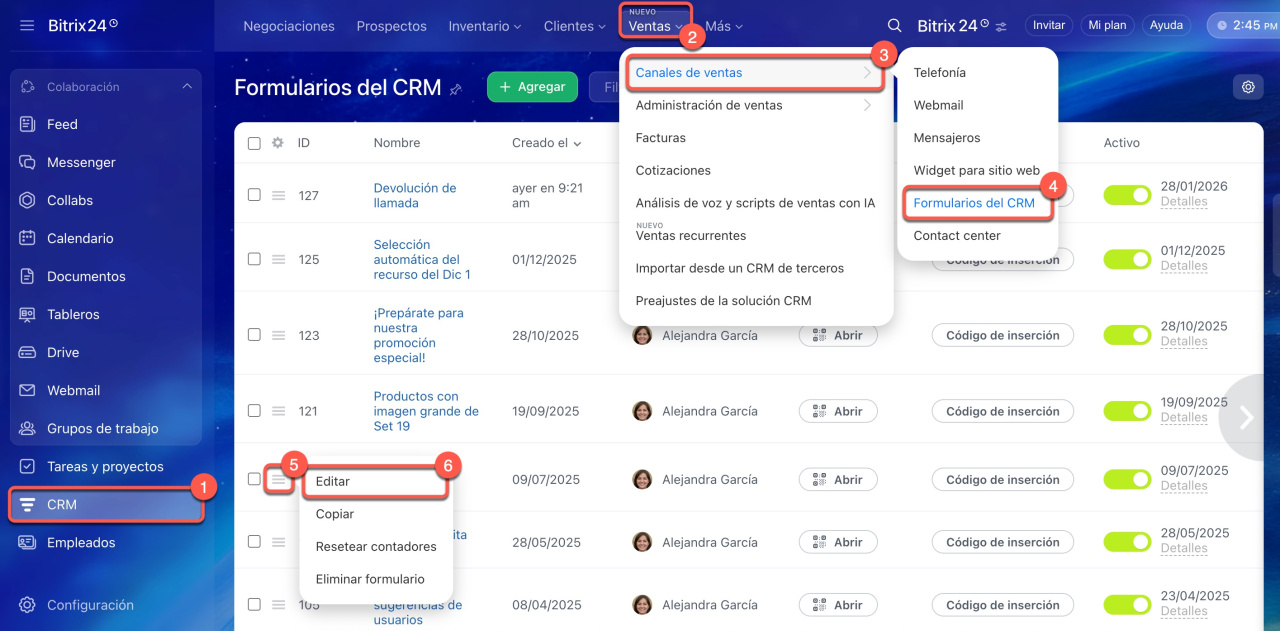1-4. Ve a CRM > Ventas > Canales de ventas > Formularios del CRM.