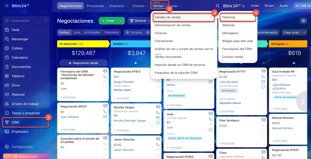 1-4. Ve a CRM > Ventas > Canales de ventas > Telefonía.