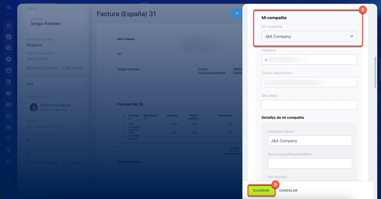- Los detalles de tu compañía pueden usarse en facturas, cotizaciones, documentos del CRM y en páginas de destino.