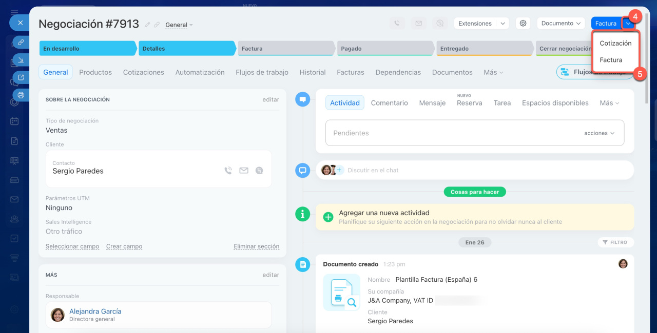 Al crear una factura o cotización, los detalles de la compañía principal se rellenan automáticamente. Para crear una factura o cotización a partir de una negociación: