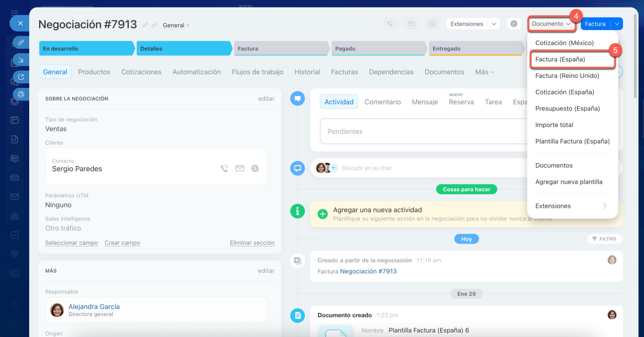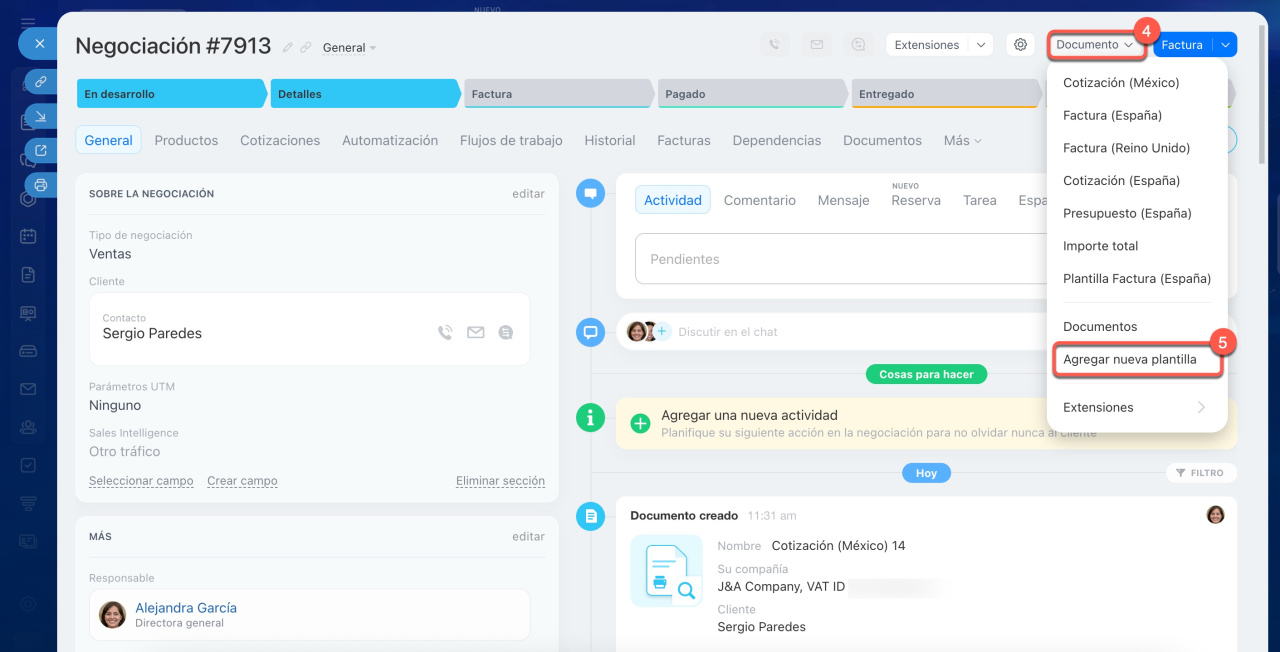 En Bitrix24, puedes añadir estos datos una sola vez y se completarán automáticamente en facturas, cotizaciones, contratos y otros documentos. Esto ahorra tiempo y reduce el riesgo de errores.