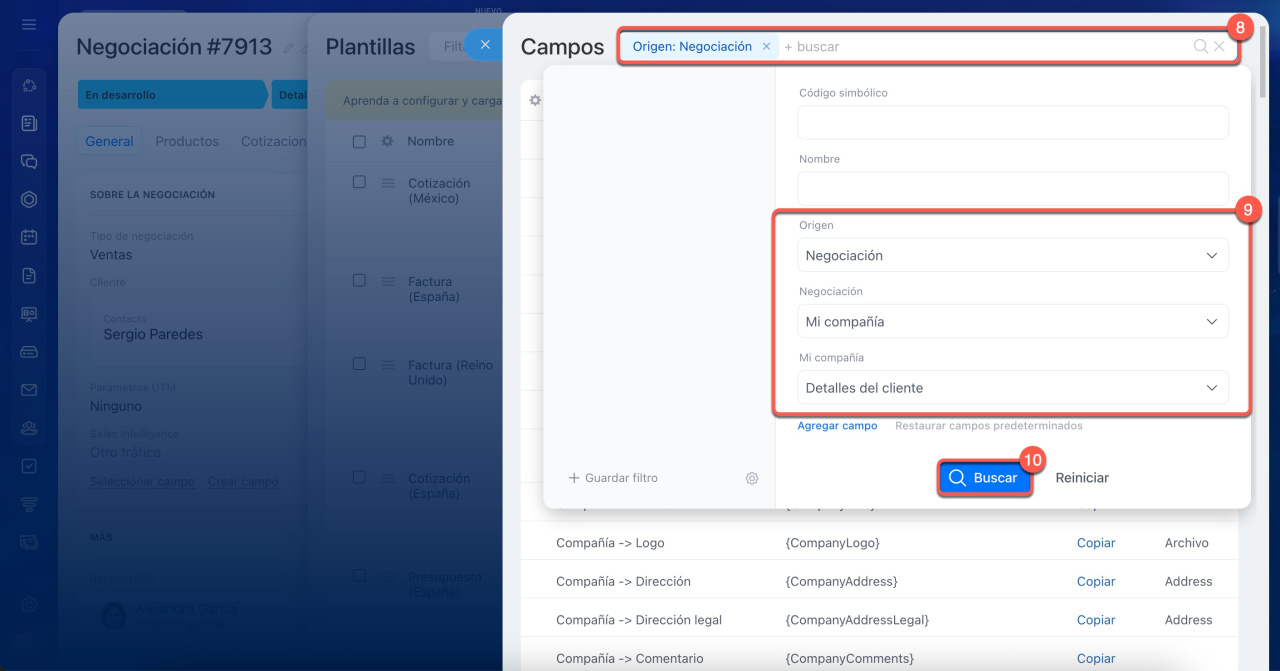 Plantillas de documentos personalizadas. Si utilizas plantillas personalizadas, tendrás que añadir manualmente los detalles de la compañía a la plantilla mediante códigos simbólicos. Estos códigos representan campos del CRM que se sustituyen por los datos reales al generar el documento.