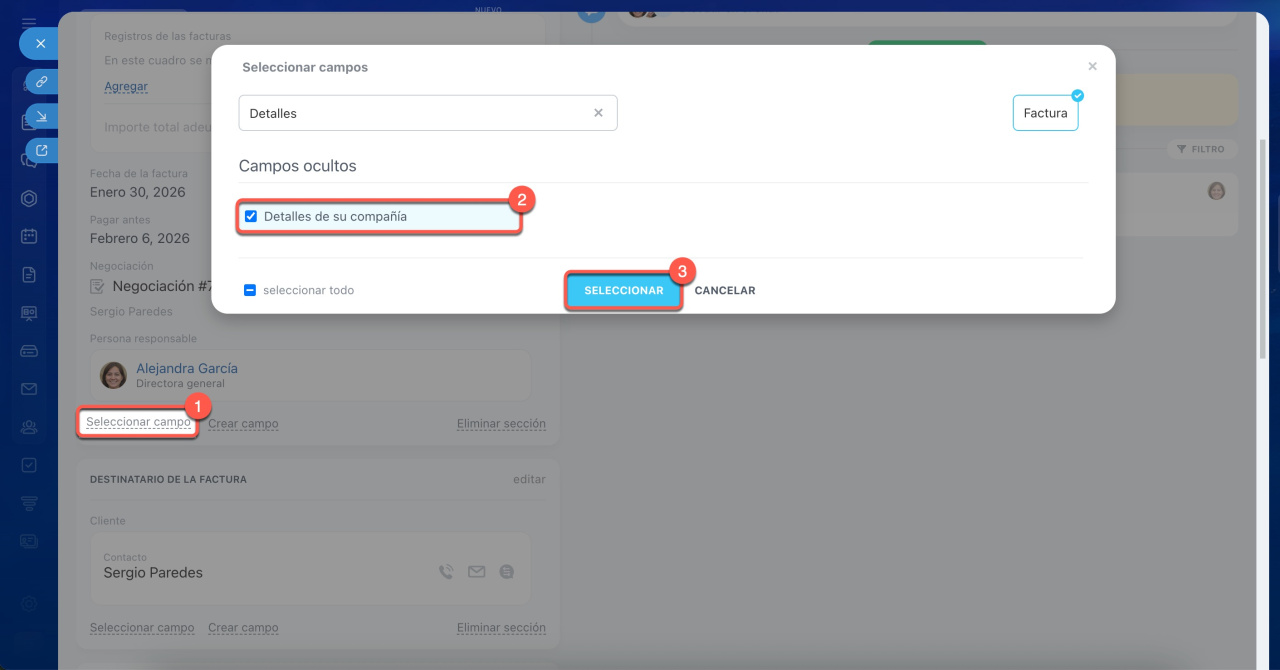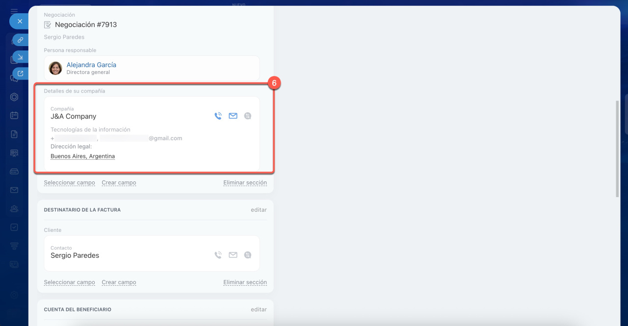 Si los detalles de la compañía no aparecen, puede que el campo Detalles de su compañía no esté activado en la ficha del CRM.
