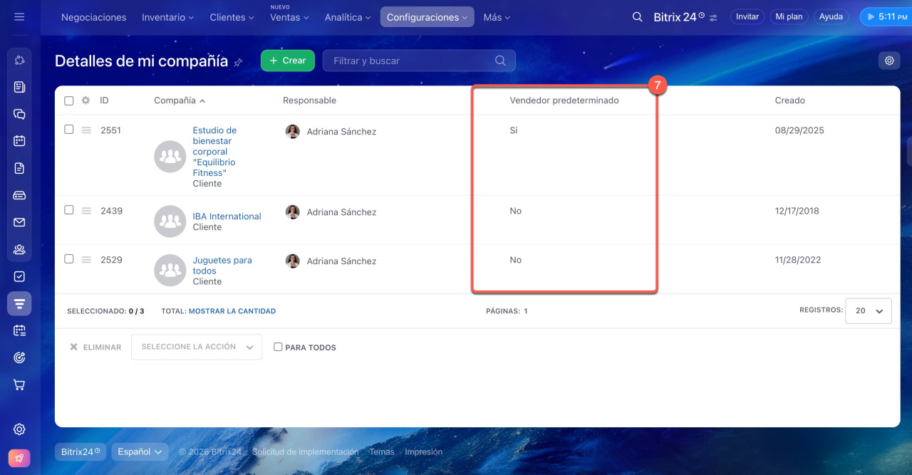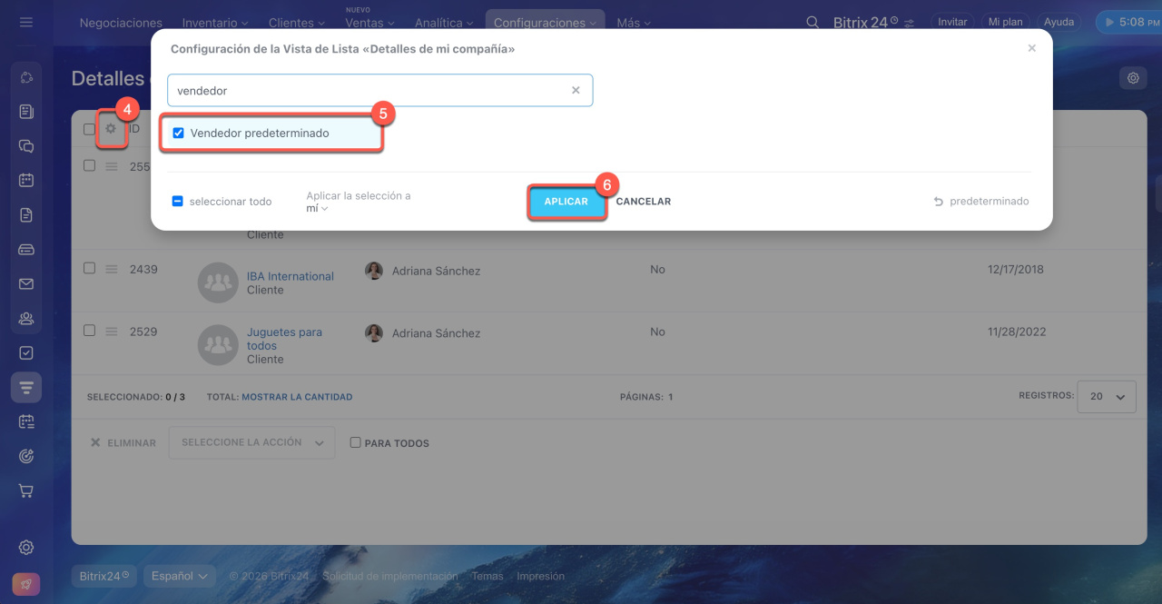 4-6. Haz clic en Configuración (⚙️) en la esquina superior izquierda de la tabla, marca la columna Vendedor predeterminado y haz clic en Aplicar.