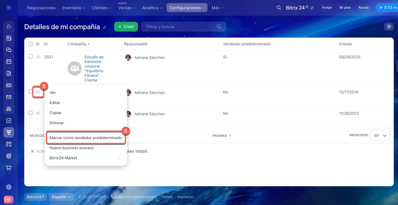 8-9. Para cambiar la compañía principal, haz clic en Menú (≡) > Marcar como vendedor predeterminado junto a la compañía deseada.