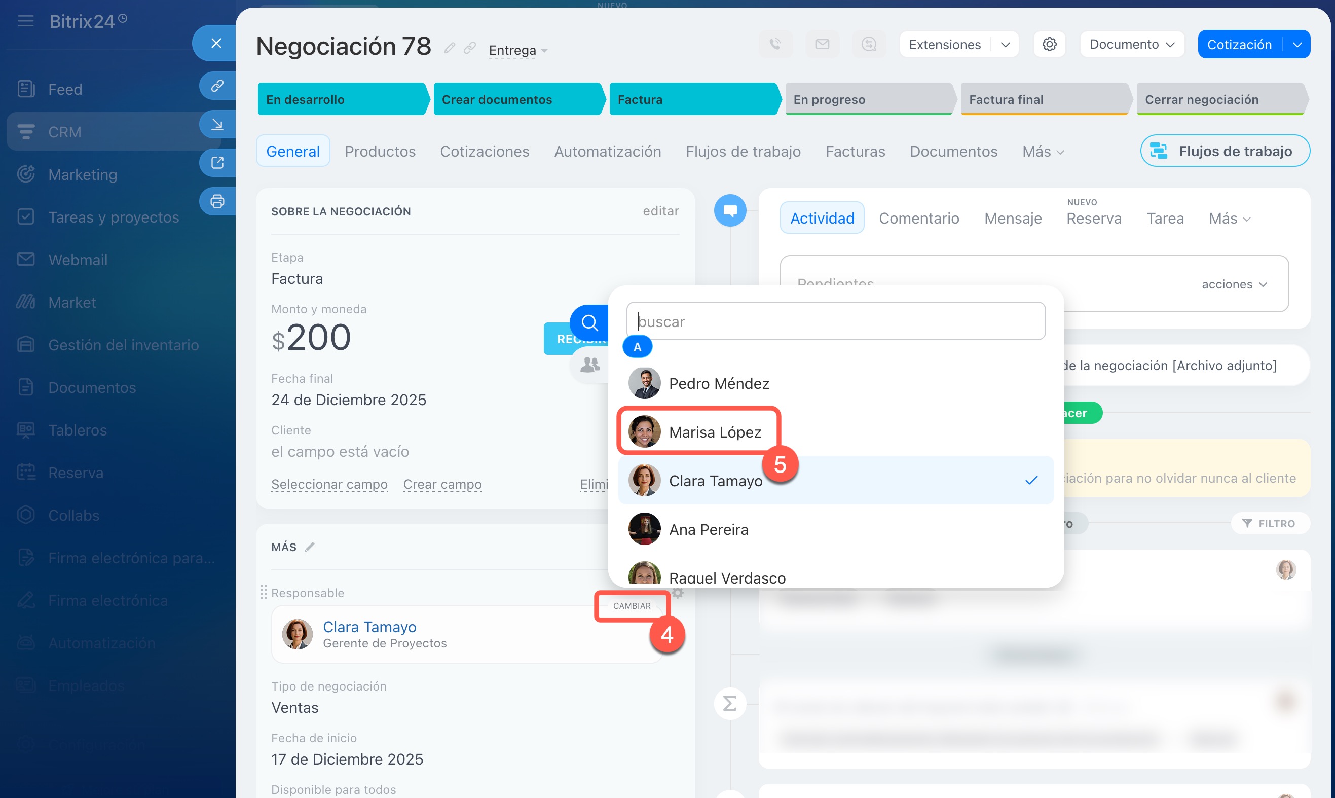 El cambio masivo de la persona responsable es útil cuando necesitas transferir varios elementos a otro empleado a la vez. Por ejemplo, si redistribuyes las negociaciones entre los gerentes.