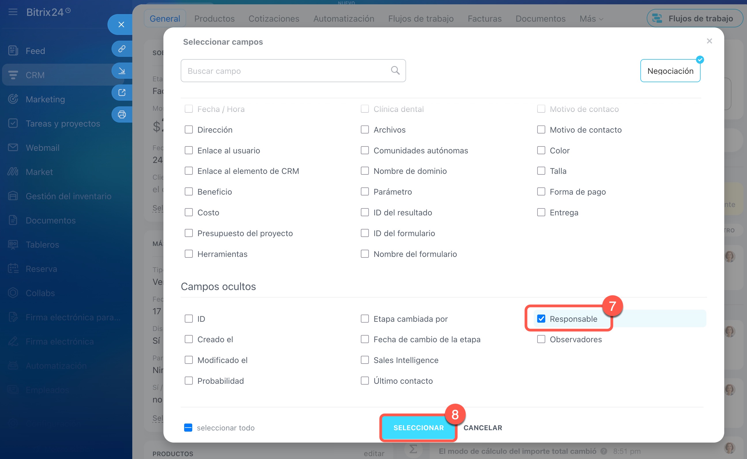6–8. Si el campo no se muestra, significa que está oculto. Para restaurarlo, haz clic en Seleccionar campo, marca Responsable en la sección Campos ocultos y haz clic en Seleccionar.