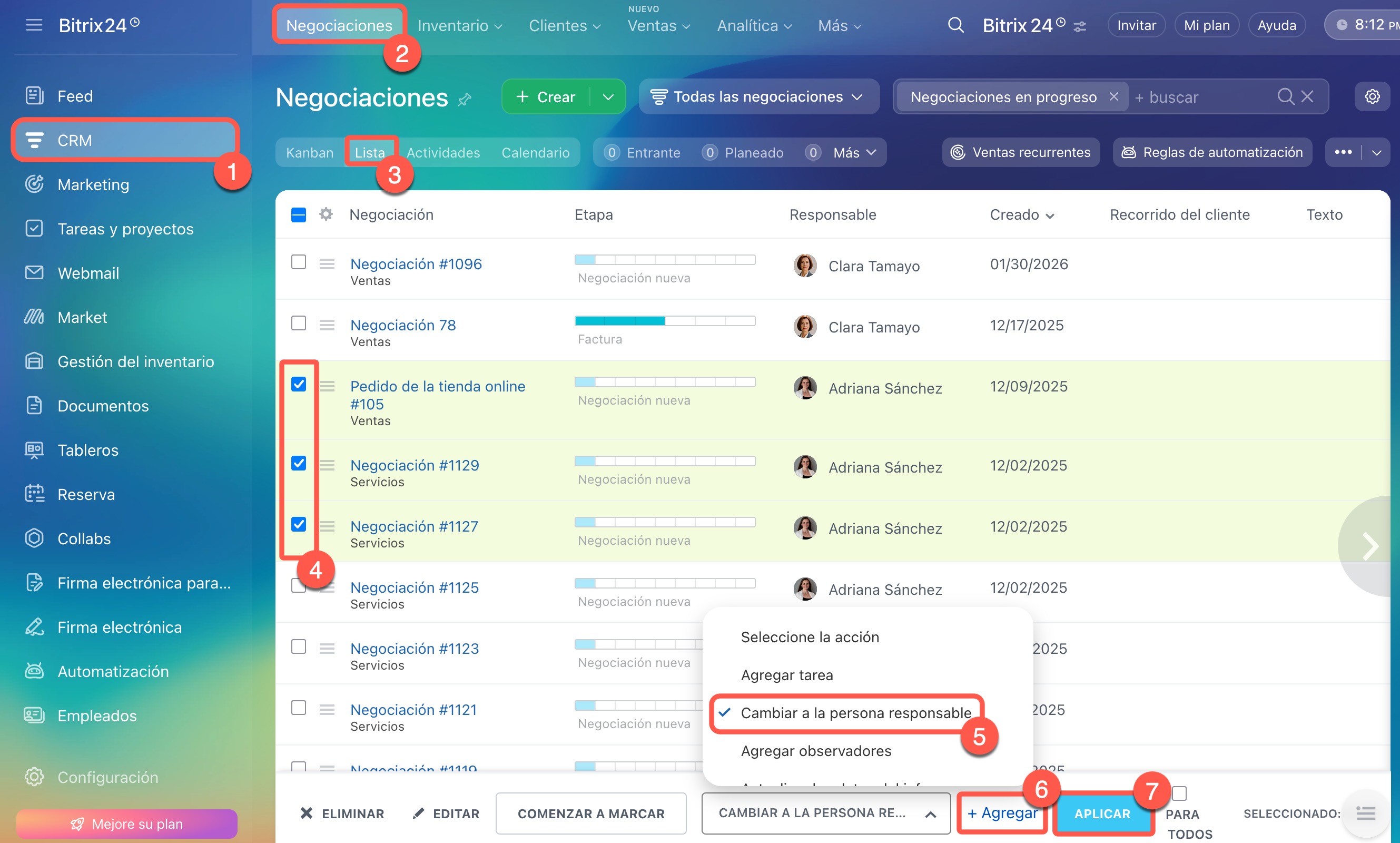 - Para cambiar el responsable en varias negociaciones a la vez, ve a CRM > Negociaciones y abre la vista en modo Lista. Selecciona las negociaciones necesarias y elige en la lista de acciones Cambiar a la persona responsable > Agregar. Indica al empleado y haz clic en Aplicar.