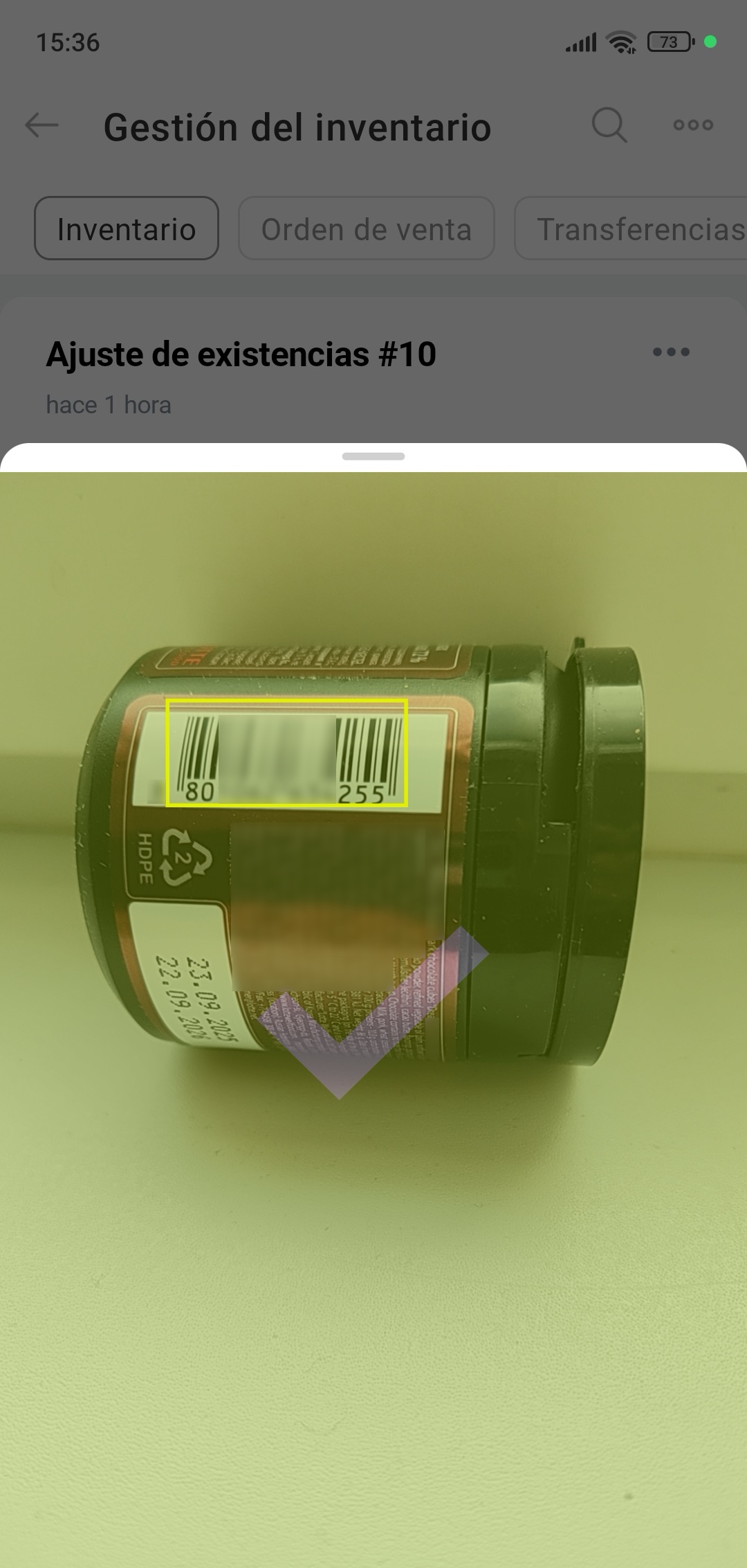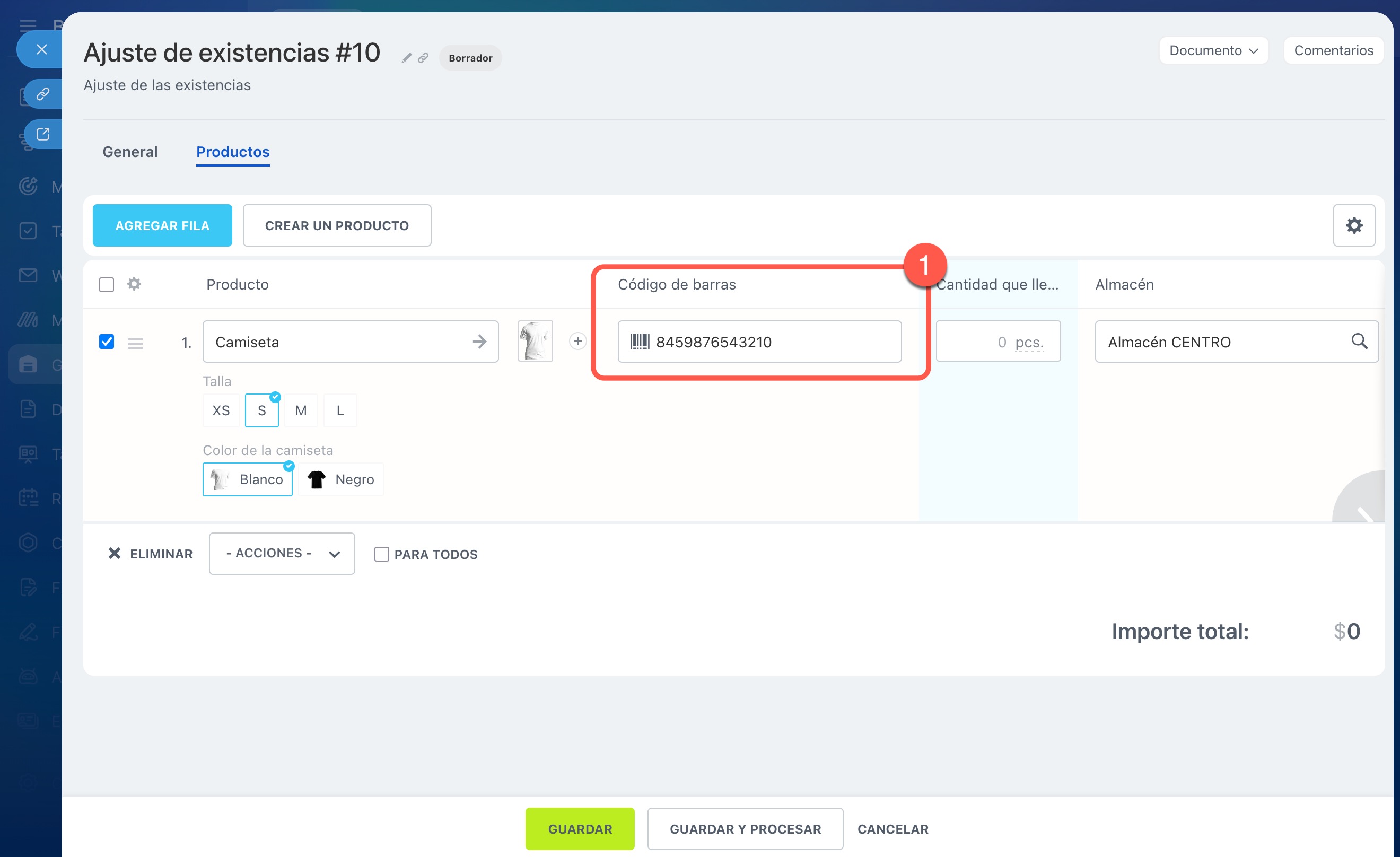 4. En el documento, haz clic en el campo Código de barras y escanea el código del producto.