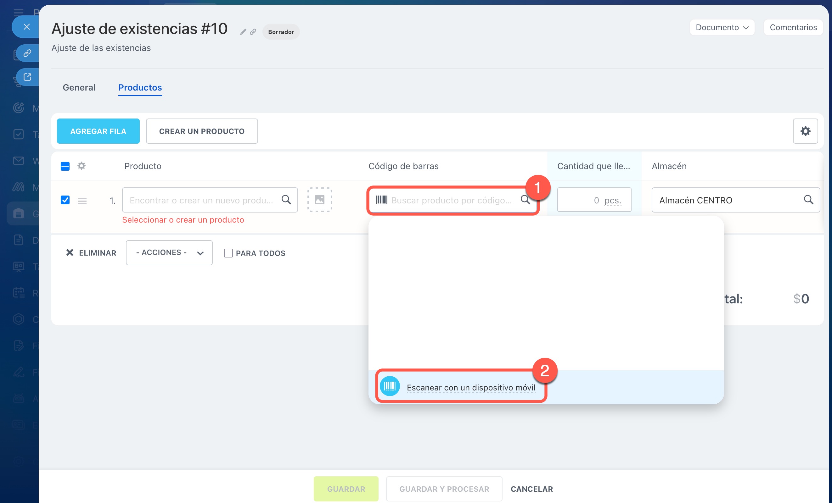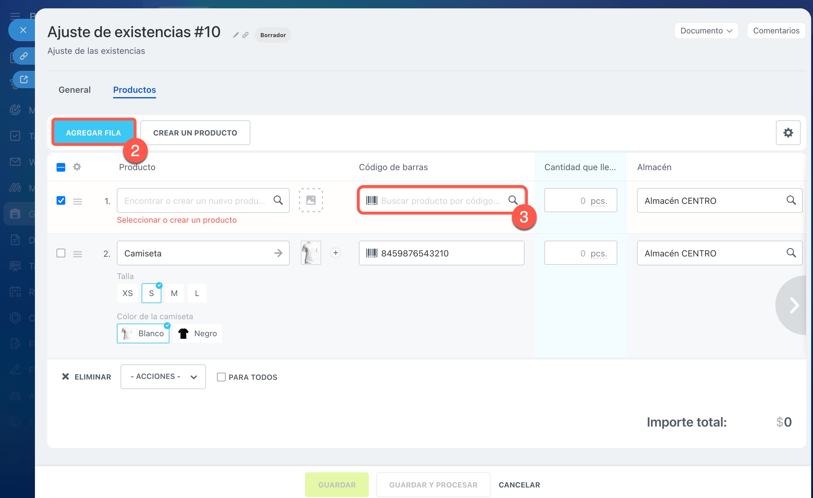 2–3. Para ingresar el siguiente producto, haz clic en Agregar fila, coloca el cursor nuevamente en el campo Código de barras y escanea el código.