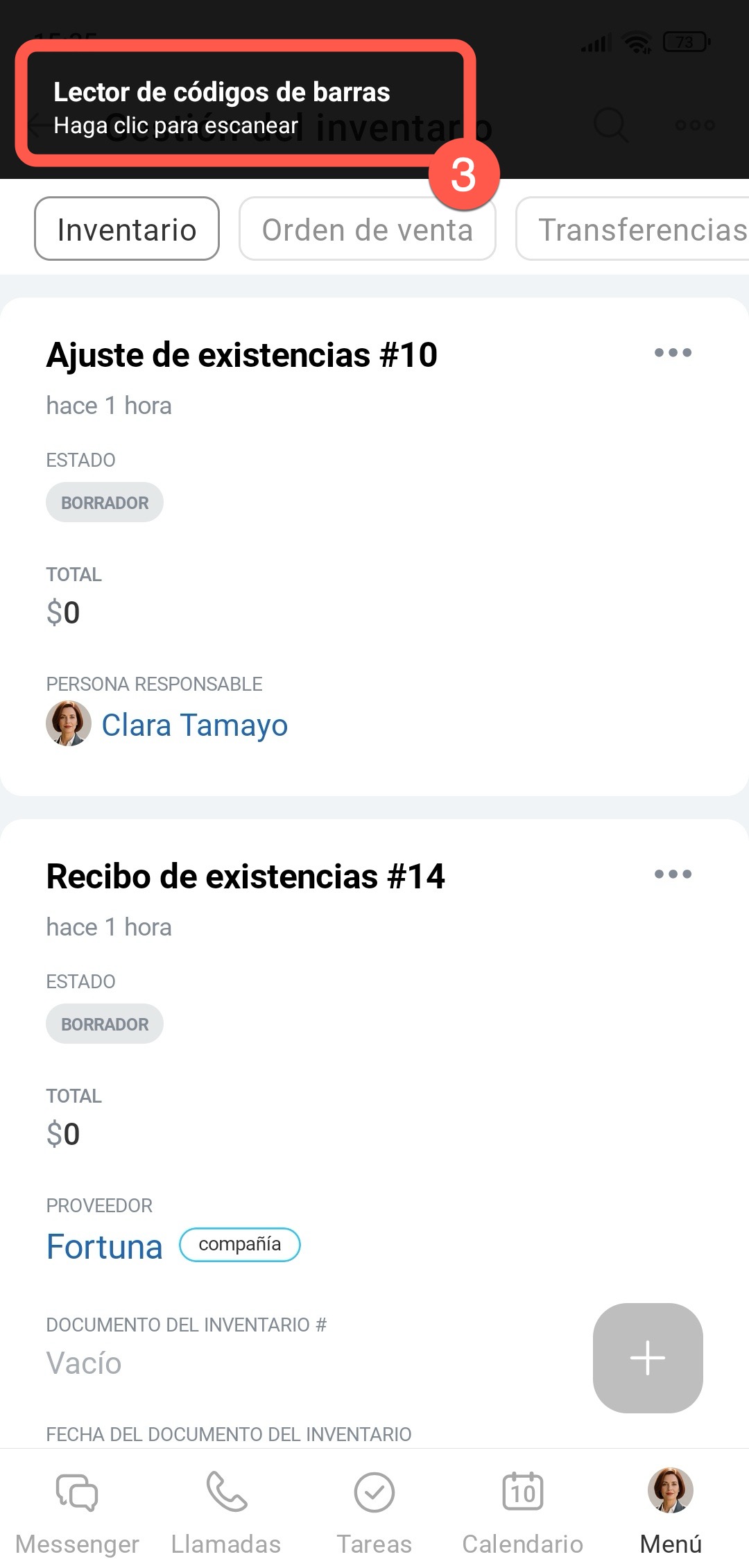 Por ejemplo, un almacenero puede recibir un envío de productos y escanear los códigos de barras de los paquetes. Los productos aparecerán automáticamente en el documento de ajuste de existencias.