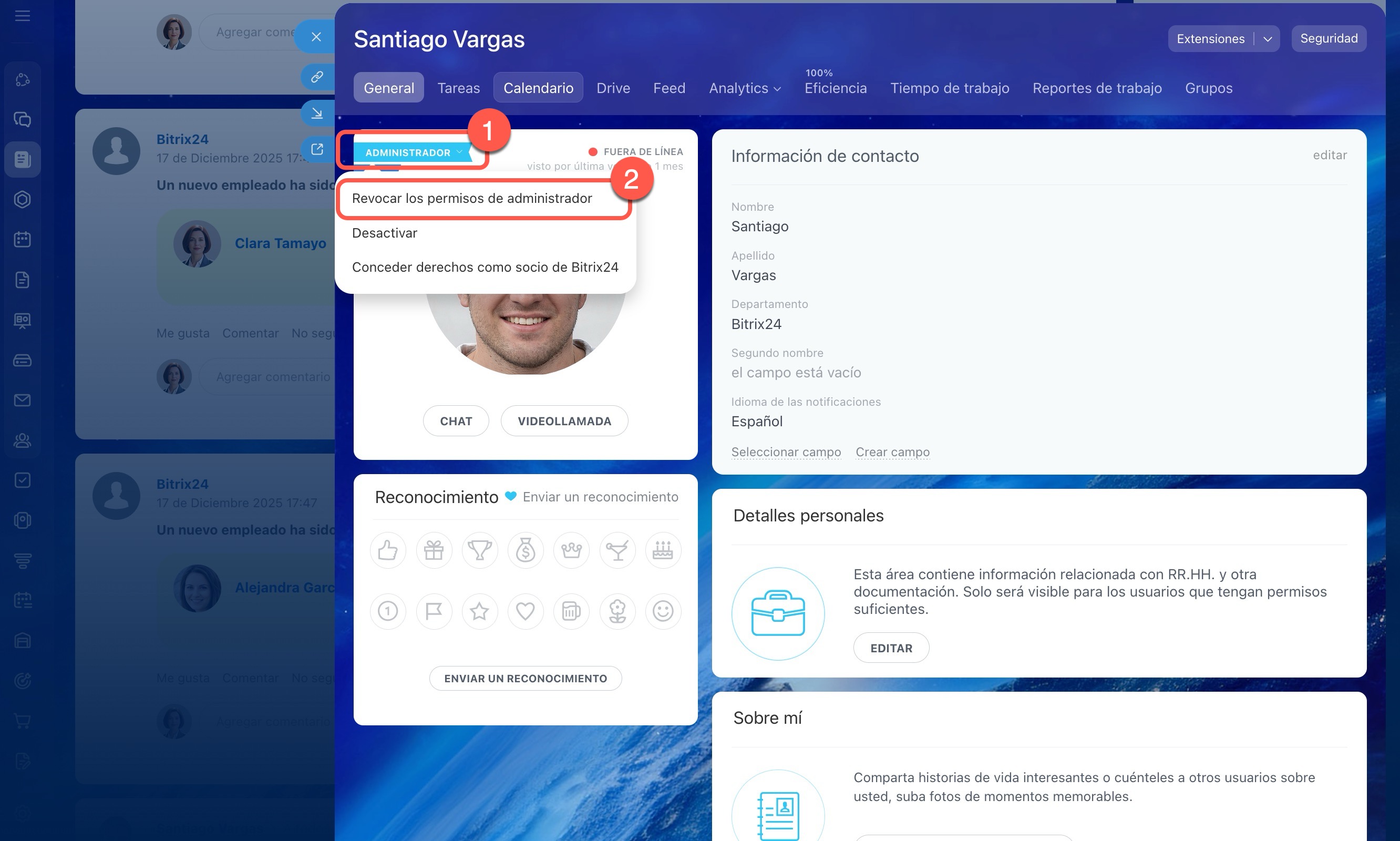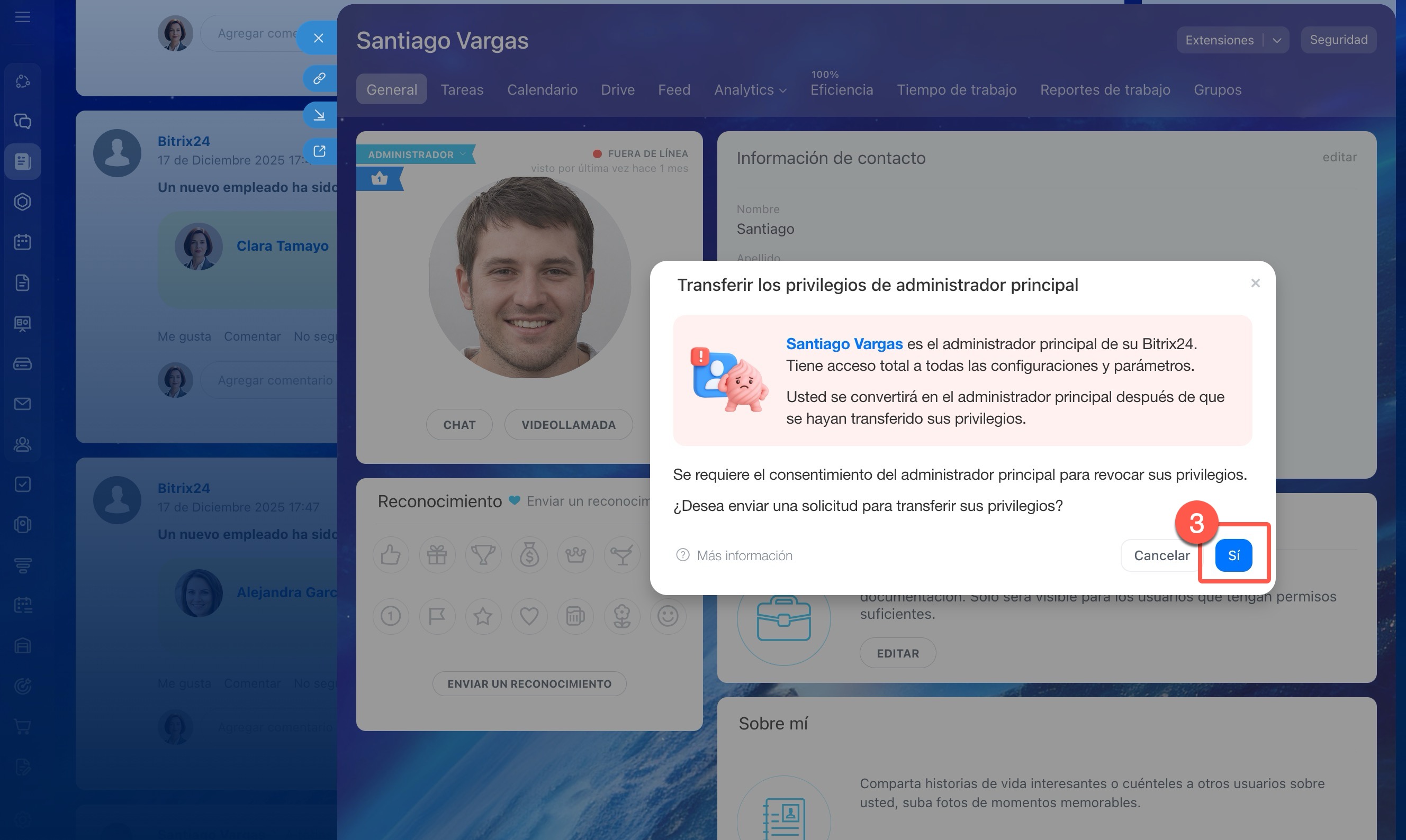 Si este empleado deja la compañía o ya no es responsable del trabajo en Bitrix24, sus derechos deben transferirse a otro usuario. Solo otro empleado con derechos de administrador puede hacerlo.