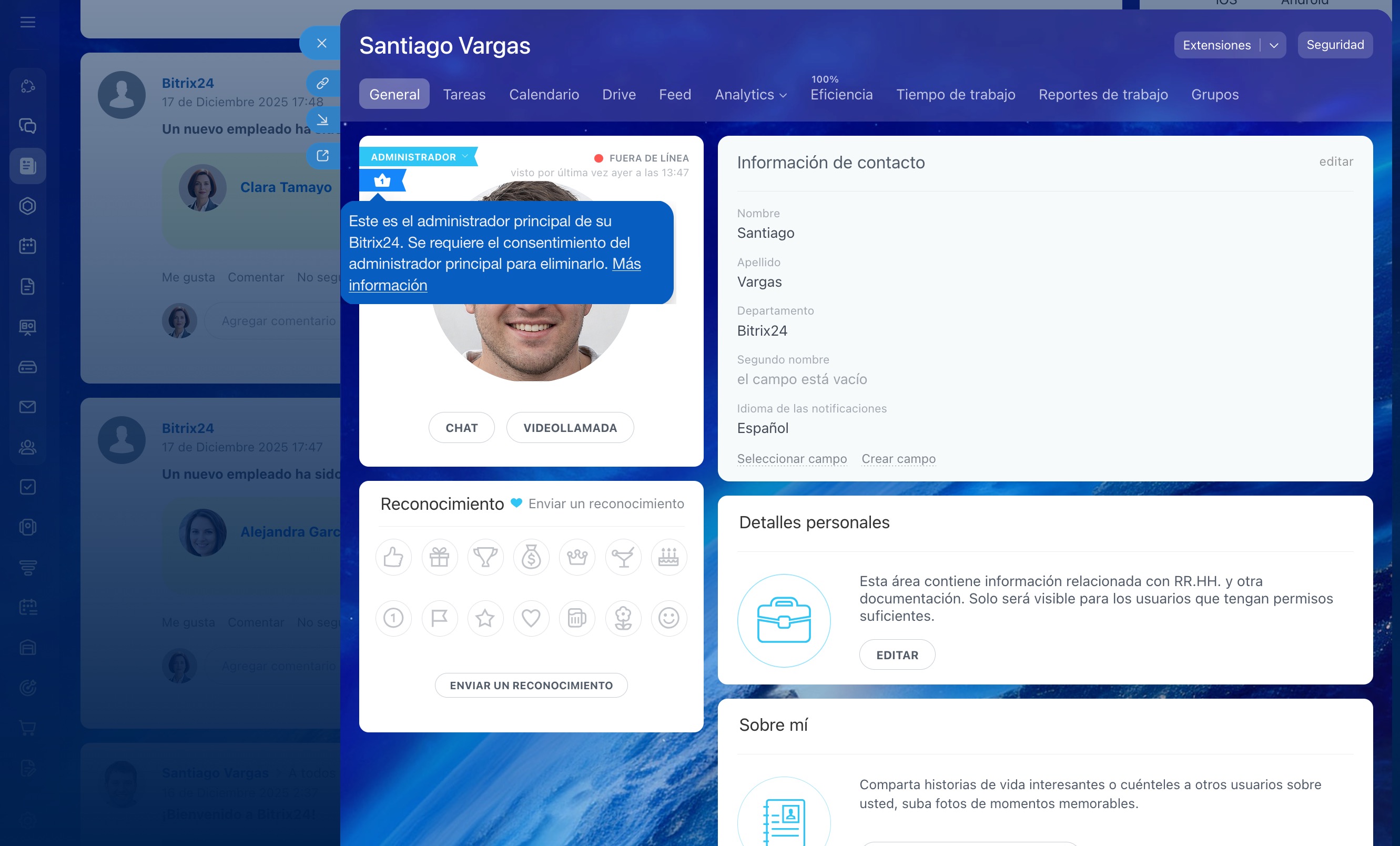 - El administrador principal es el empleado que creó tu Bitrix24. A su correo electrónico llegan notificaciones del sistema: renovación del plan, noticias e invitaciones a webinars.