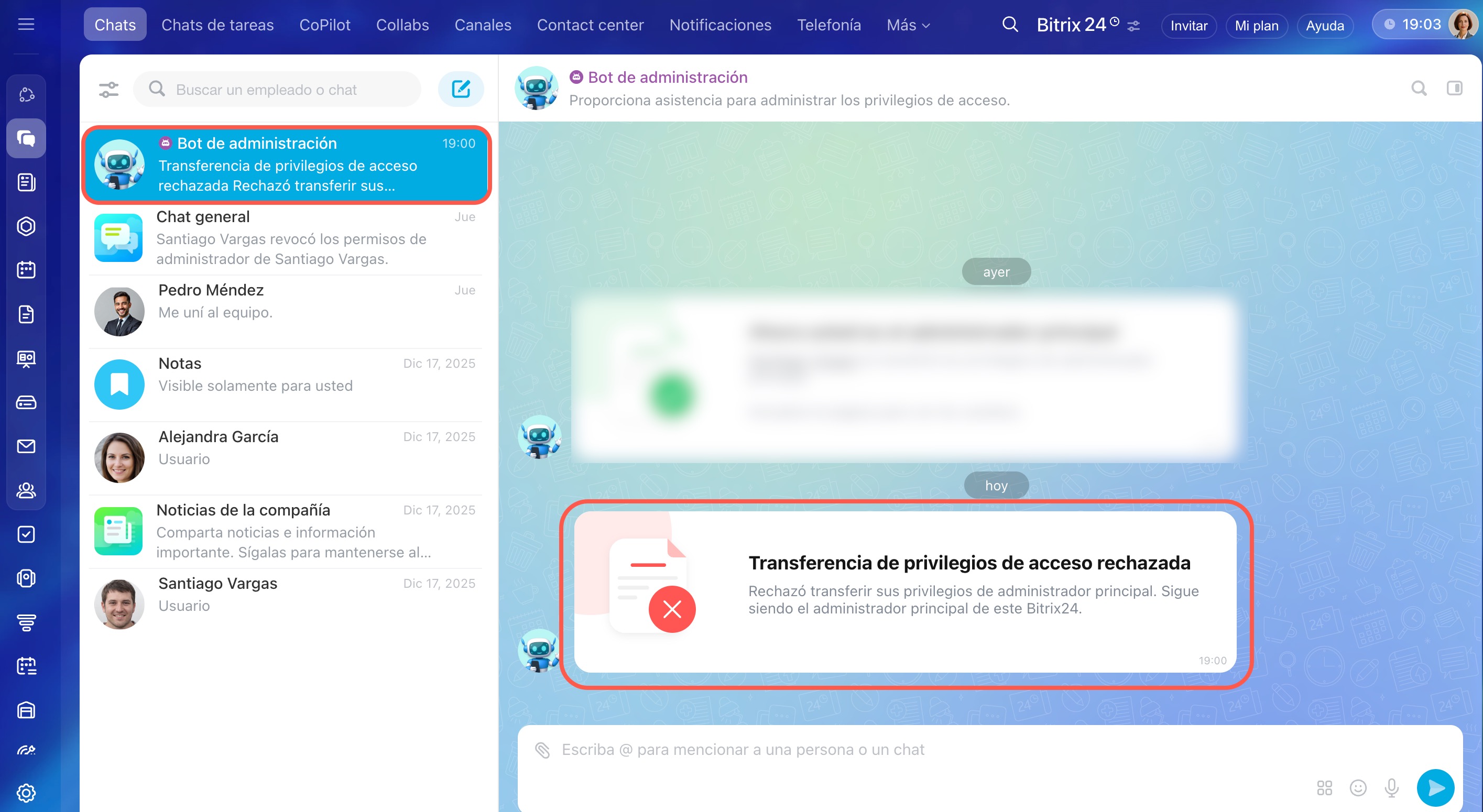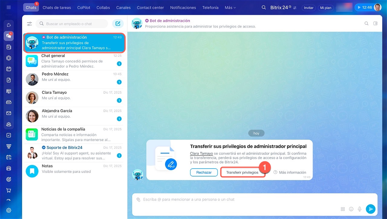 - El administrador principal recibirá un mensaje del Bot de administración con la solicitud de transferir derechos e información sobre el empleado que envió la solicitud.