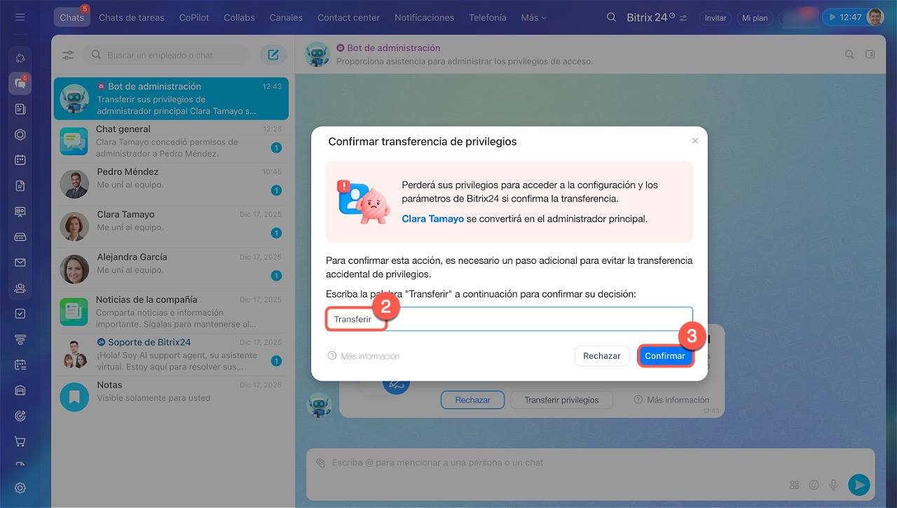 - Haz clic en Confirmar. Después de esto, los derechos de administrador principal serán transferidos a otro empleado.