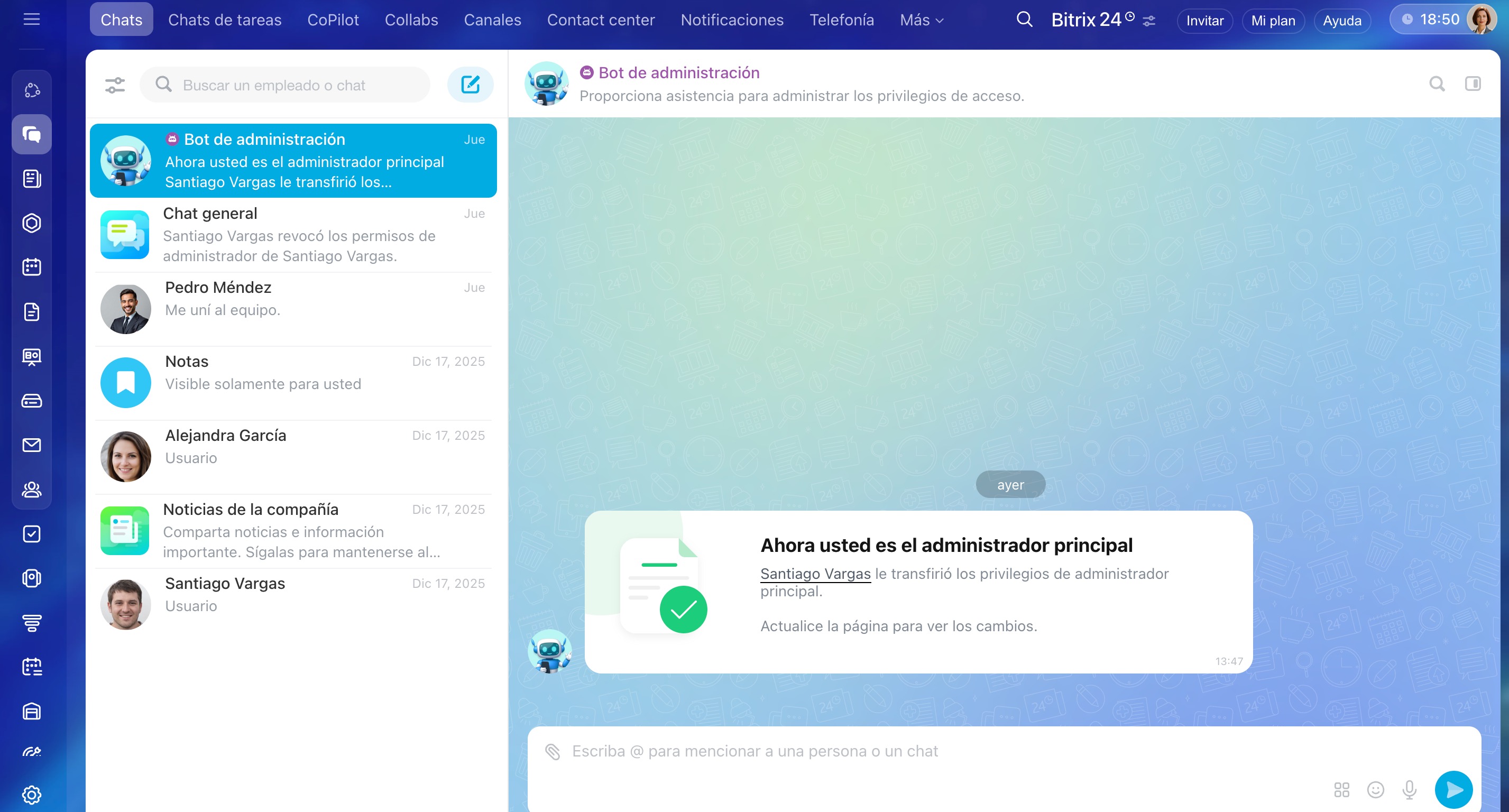 El administrador principal recibirá un mensaje del Bot de administración con la solicitud de transferir derechos e información sobre el empleado que envió la solicitud.