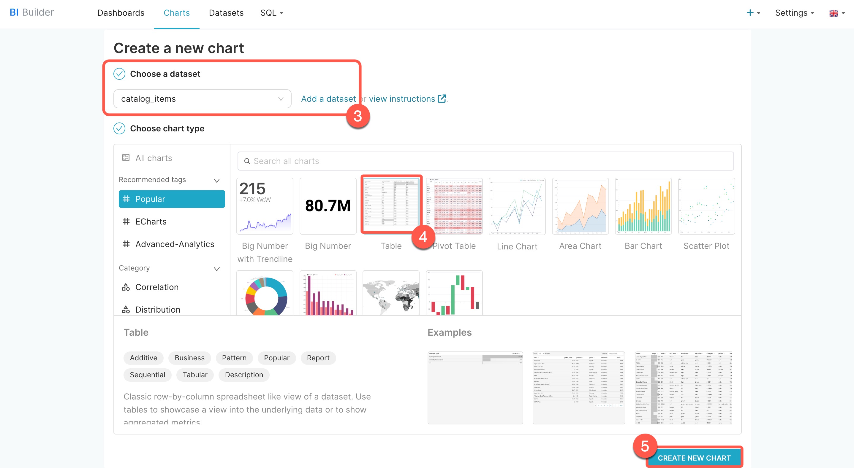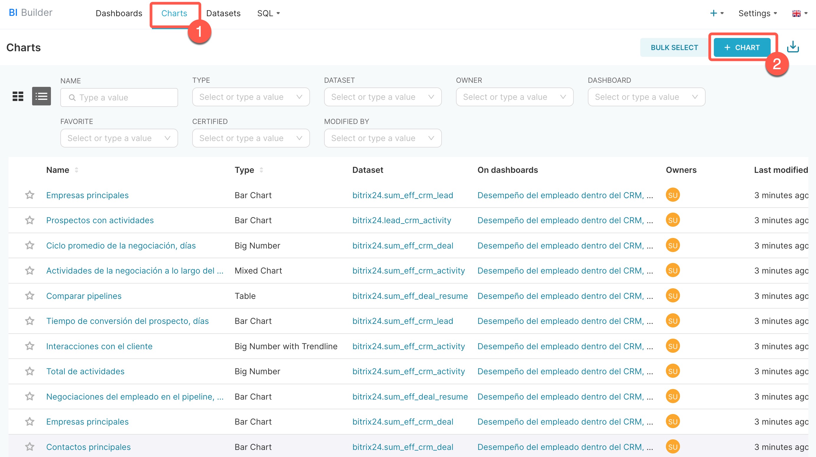 - 1–2. Abre BI Builder > Charts > + Chart.